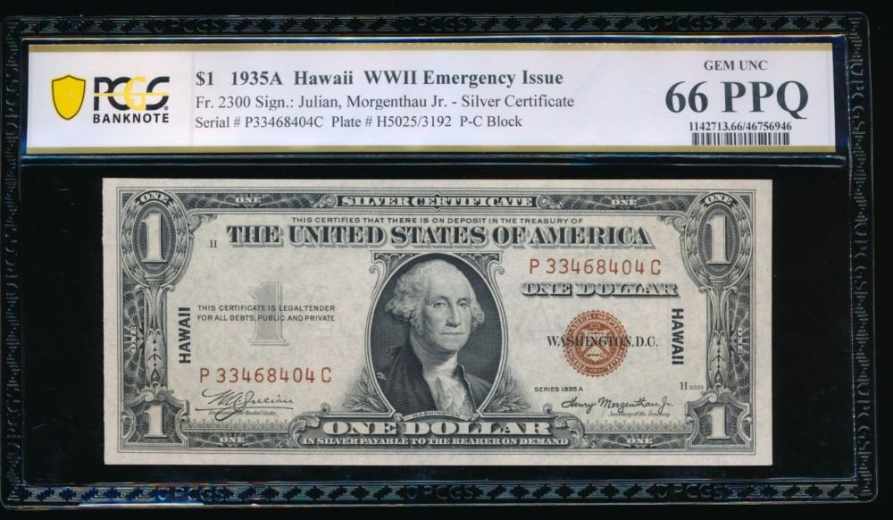 One 1935A $1 Hawaii Silver Certificate PCGS 66PPQ.