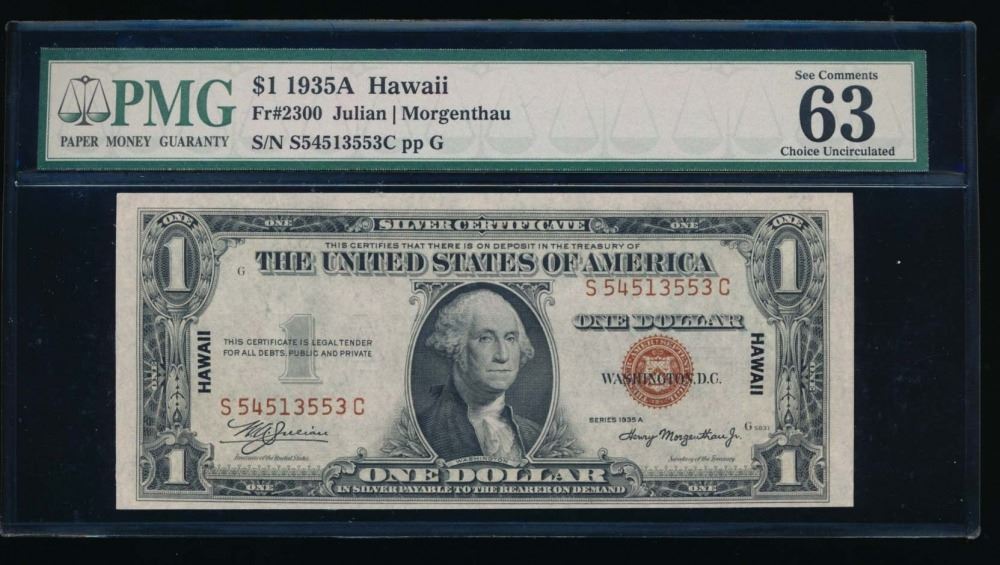 One 1935A $1 Hawaii Silver Certificate PMG 63EPQ.