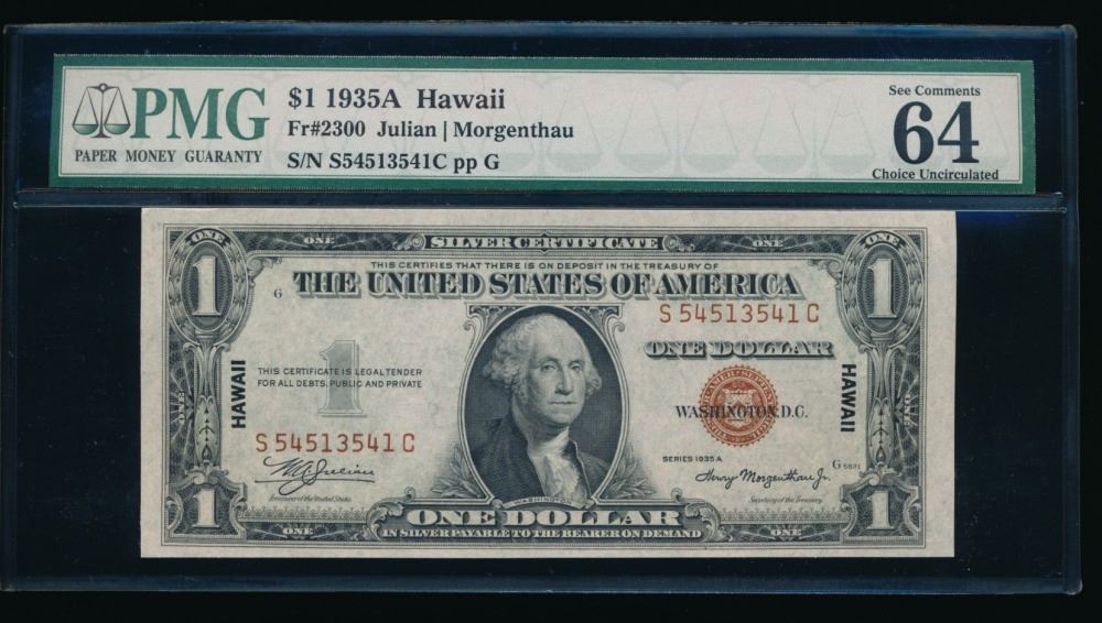 One 1935A $1 Hawaii Silver Certificate PMG 64EPQ.