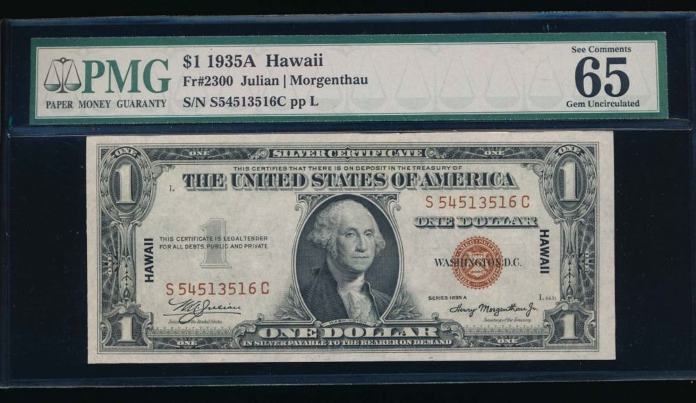 One 1935A $1 Hawaii Silver Certificate PMG 65EPQ.