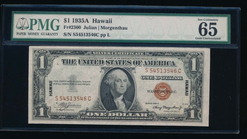 One 1935A $1 Hawaii Silver Certificate PMG 65.