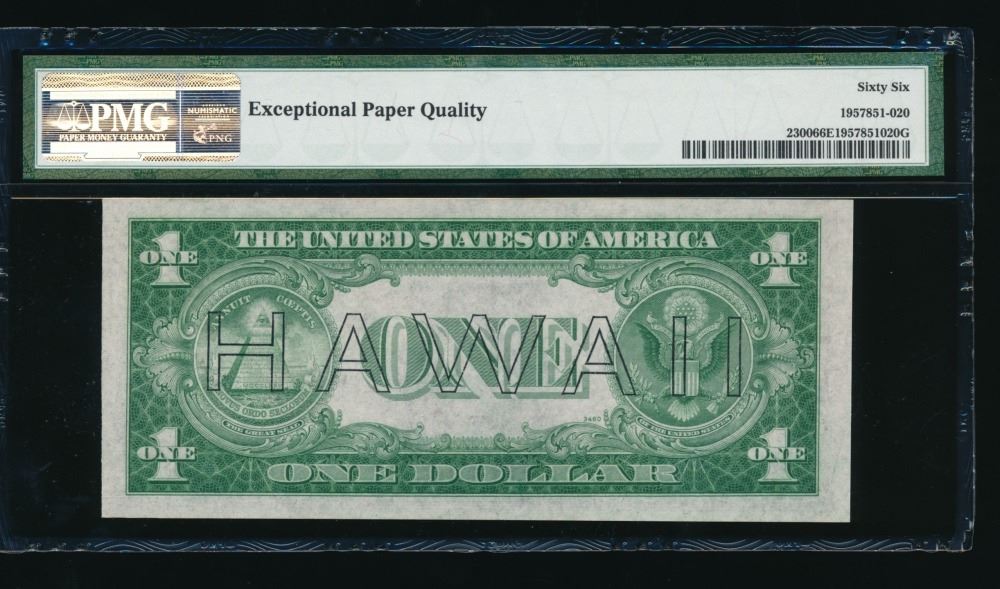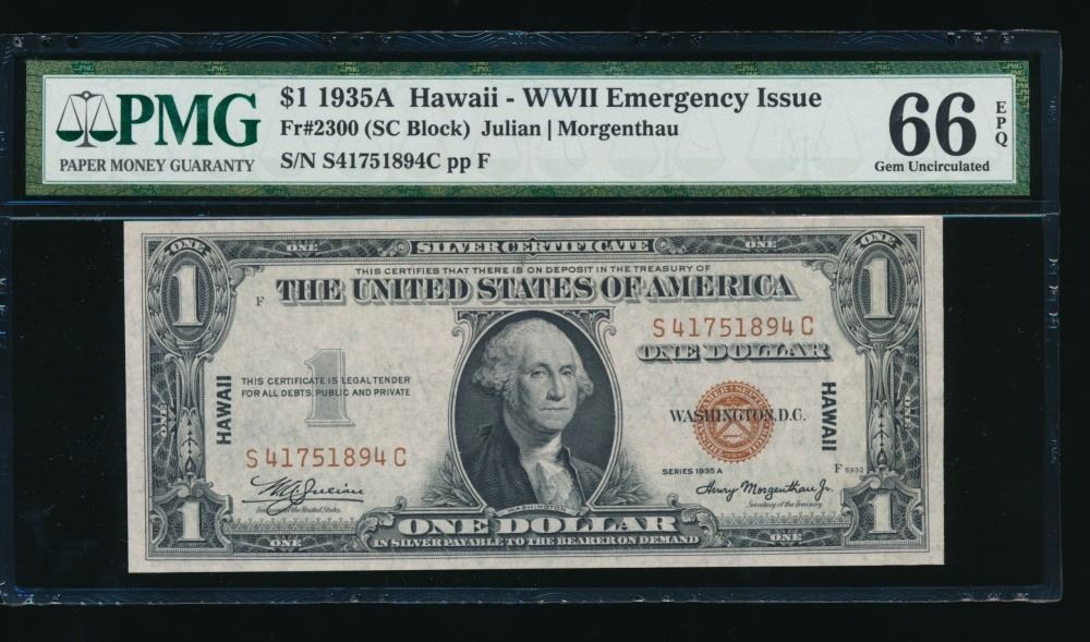 One 1935A $1 Hawaii Silver Certificate PMG 66EPQ.