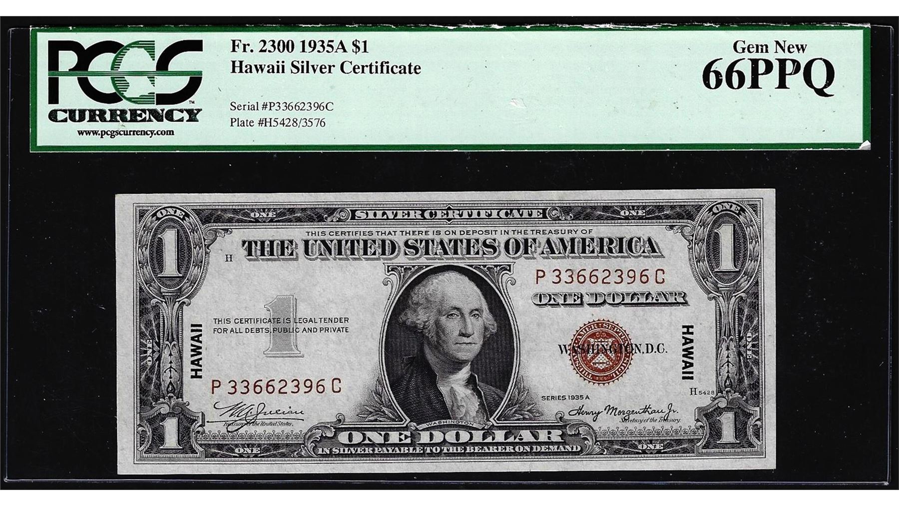 One 1935A $1 Hawaii Silver Certificate WWII Emergency Note Fr.2300 PCGS Gem New 66PPQ. PCGS Graded.