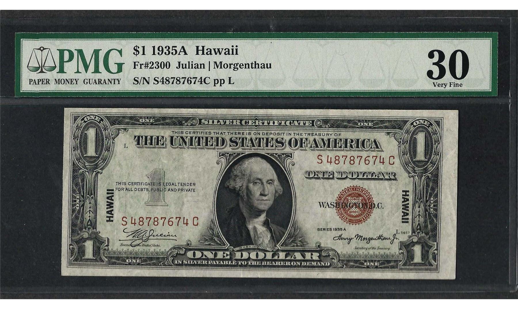 One 1935A $1 Hawaii Silver Certificate WWII Emergency Note Fr.2300 PMG Very Fine 30. PMG Certified.