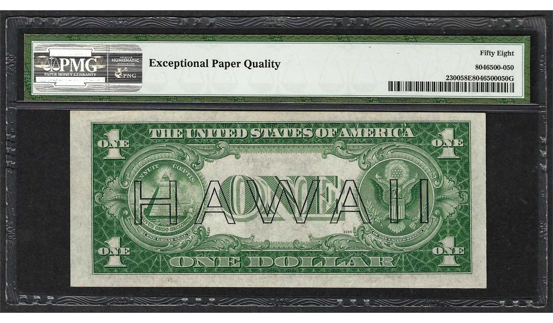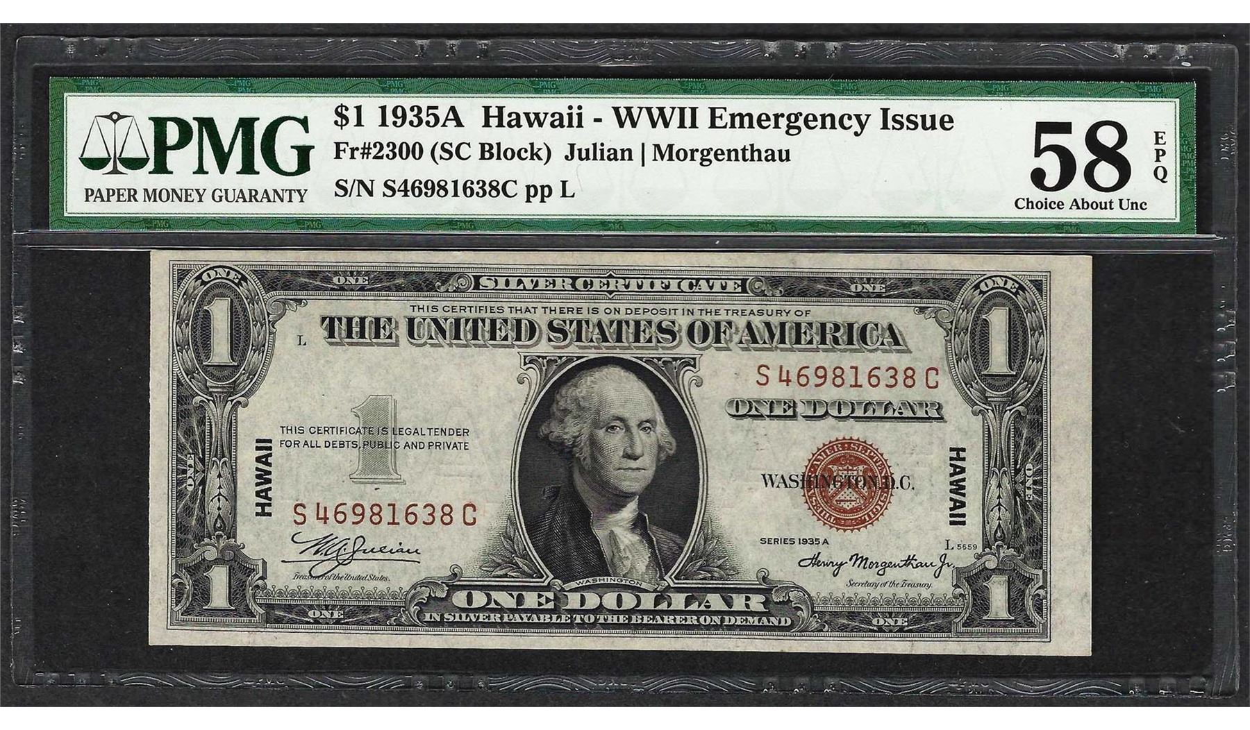 One 1935A $1 Hawaii Silver Certificate WWII Emergency Note PMG Choice About Uncirculated 58EPQ. PMG Certified.