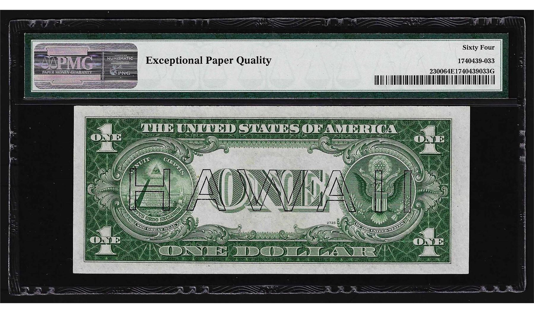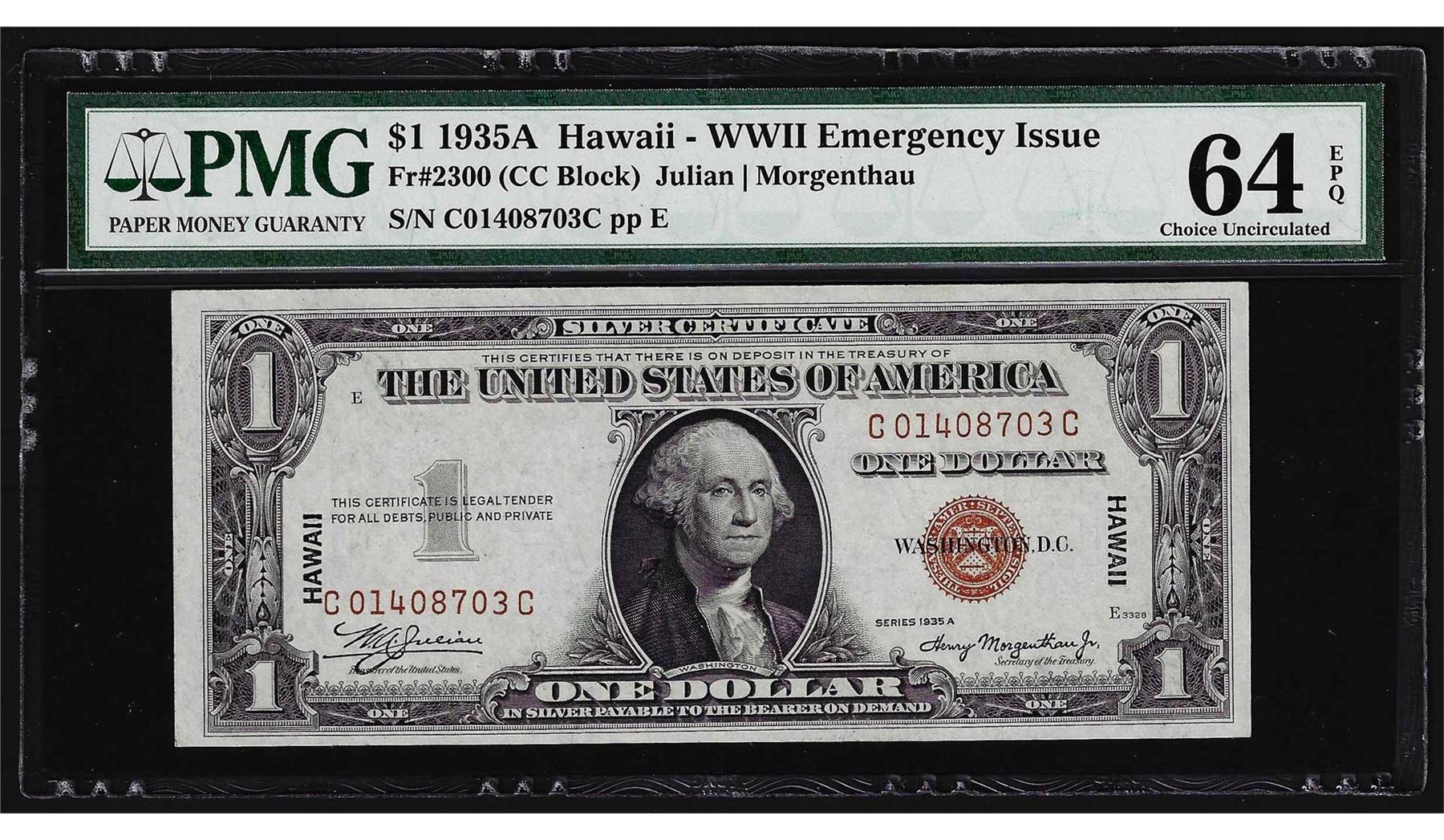 One 1935A $1 Hawaii Silver Certificate WWII Emergency Note PMG Choice Unc. 64EPQ. PMG Certified.