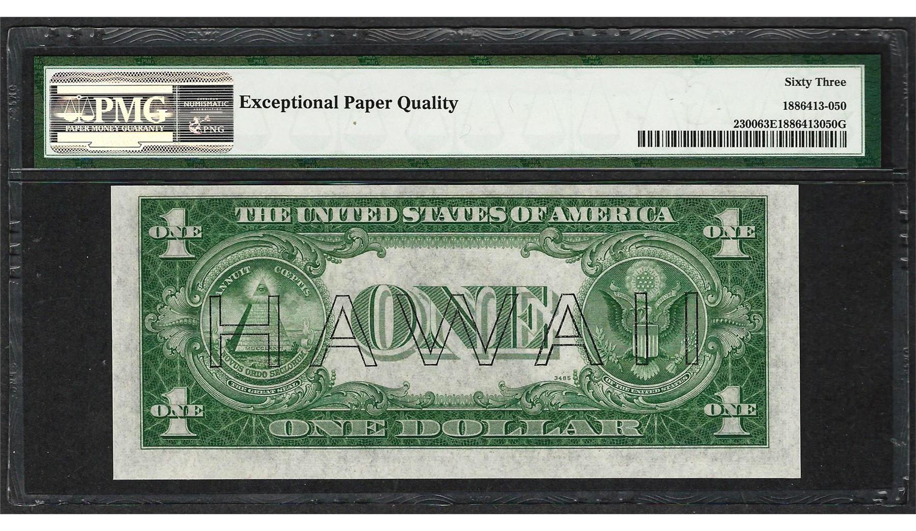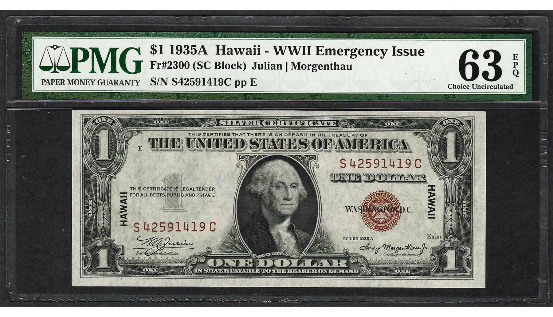 One 1935A $1 Hawaii Silver Certificate WWII Emergency Note PMG Choice Uncirculated 63EPQ. PMG Certified.