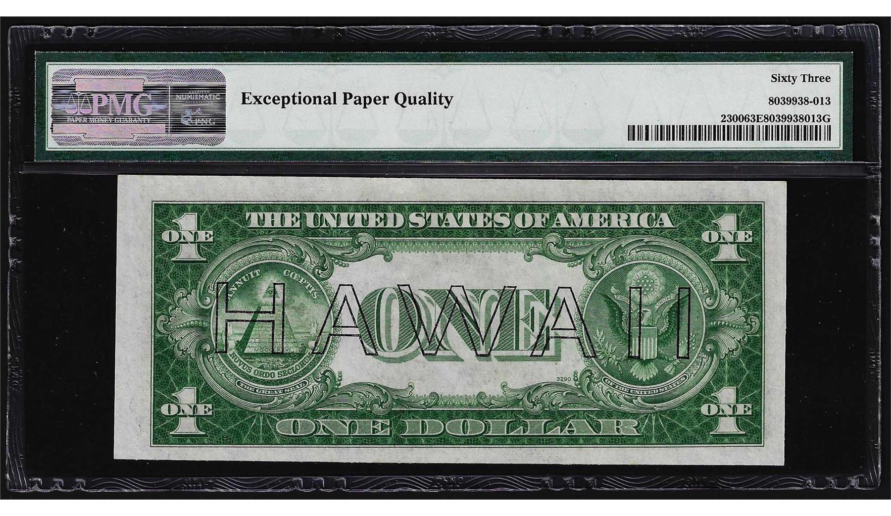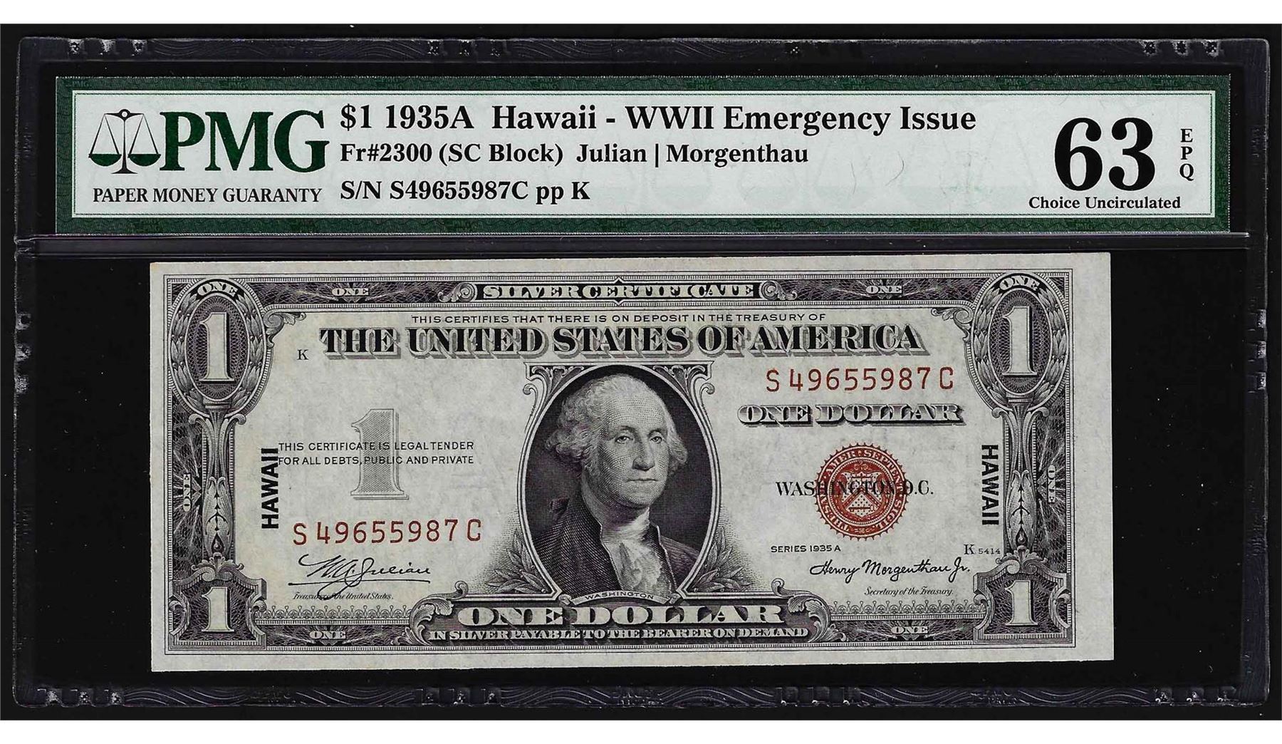 One 1935A $1 Hawaii Silver Certificate WWII Emergency Note PMG Choice Uncirculated 63EPQ. PMG Certified.