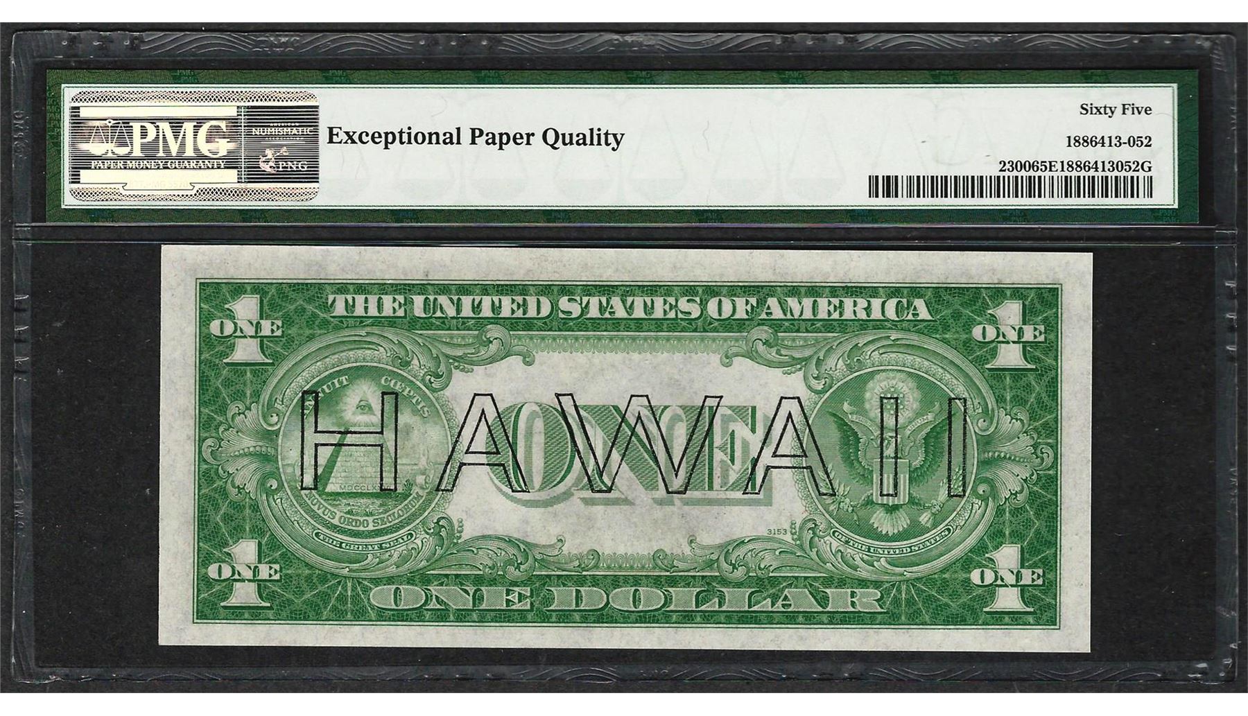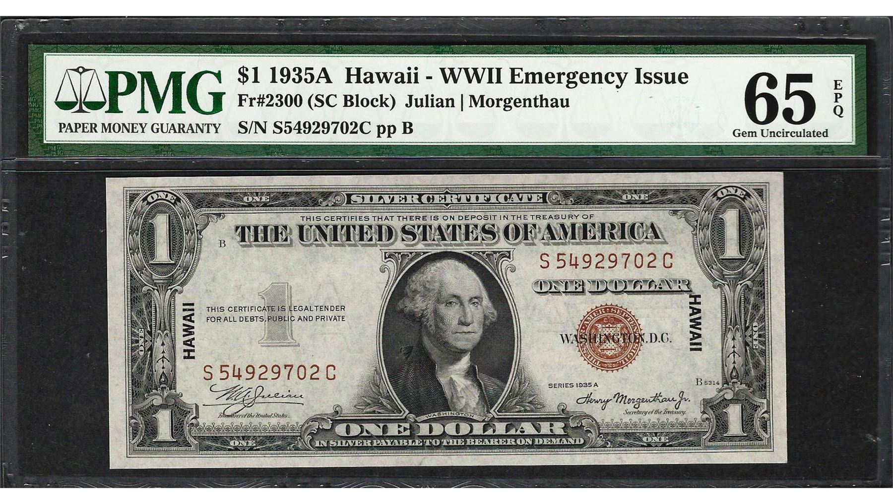 One 1935A $1 Hawaii Silver Certificate WWII Emergency Note PMG Gem Uncirculated 65EPQ. PMG Certified.