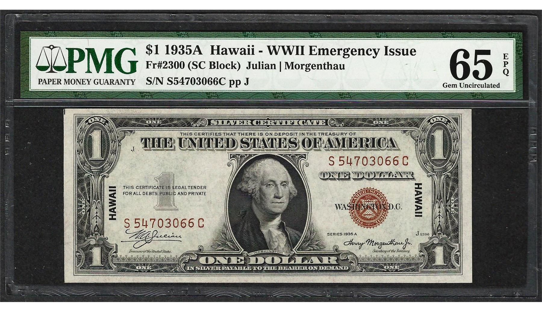 One 1935A $1 Hawaii Silver Certificate WWII Emergency Note PMG Gem Uncirculated 65EPQ. PMG Certified.