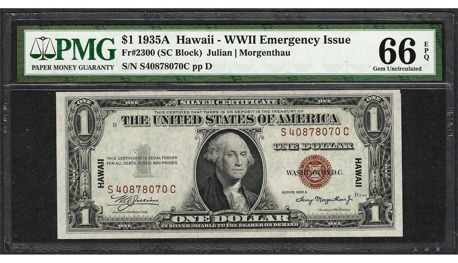 One 1935A $1 Hawaii Silver Certificate WWII Emergency Note PMG Gem Uncirculated 66EPQ. PMG Certified.
