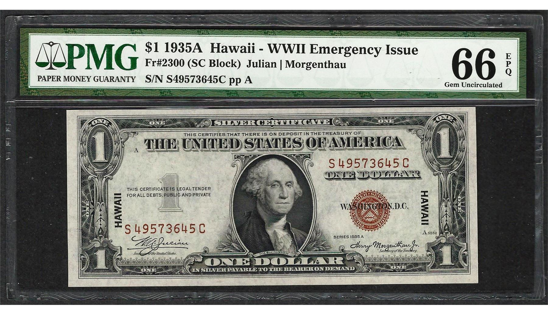 One 1935A $1 Hawaii Silver Certificate WWII Emergency Note PMG Gem Uncirculated 66EPQ. PMG Certified.