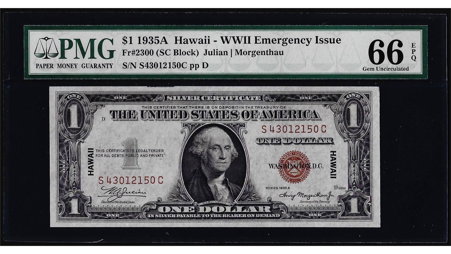 One 1935A $1 Hawaii Silver Certificate WWII Emergency Note PMG Gem Uncirculated 66EPQ. PMG Certified.