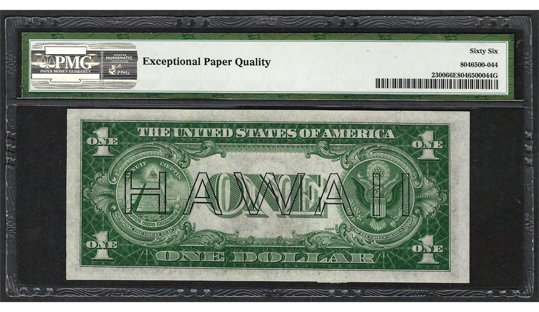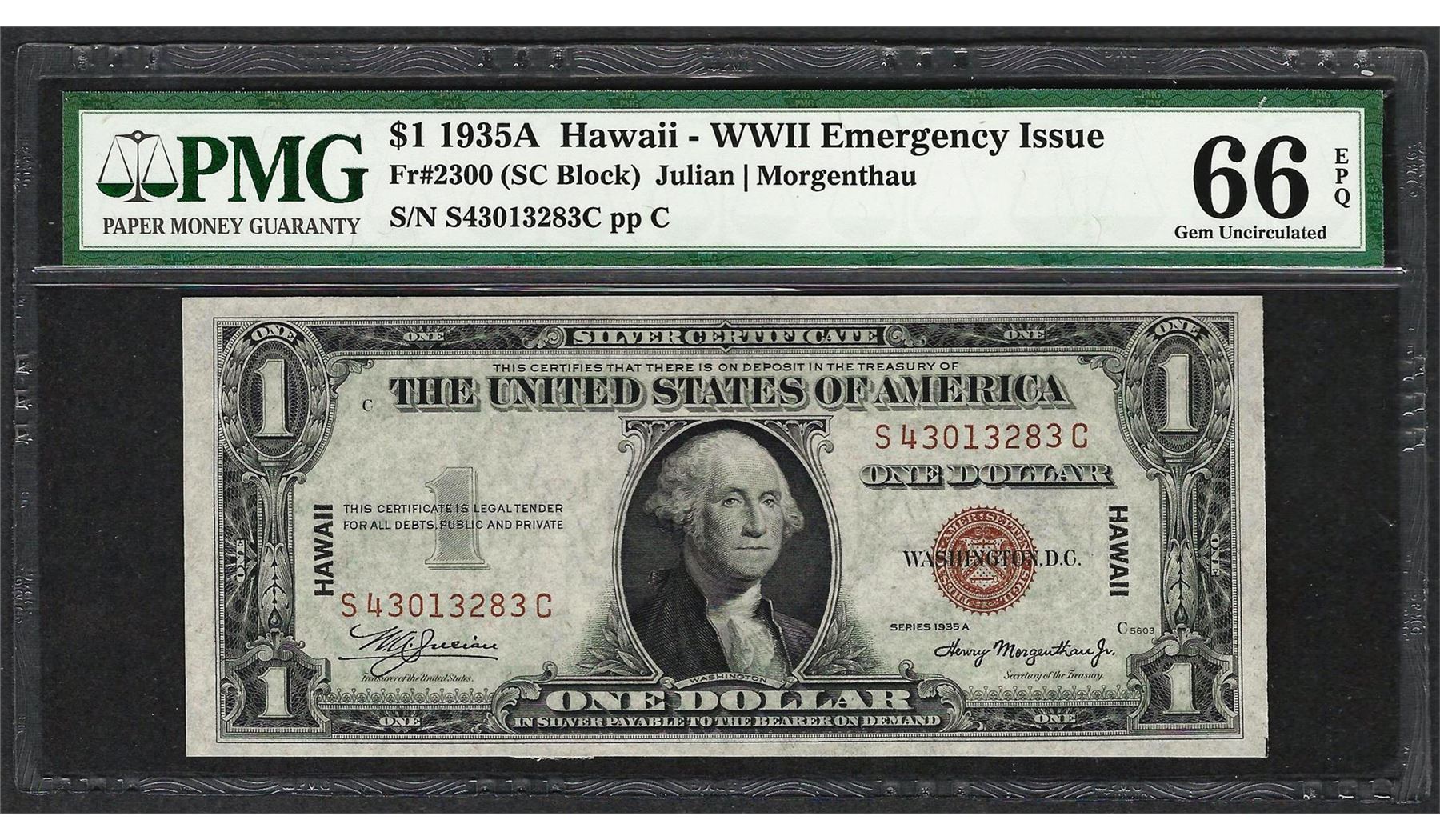 One 1935A $1 Hawaii Silver Certificate WWII Emergency Note PMG Gem Uncirculated 66EPQ. PMG Certified.