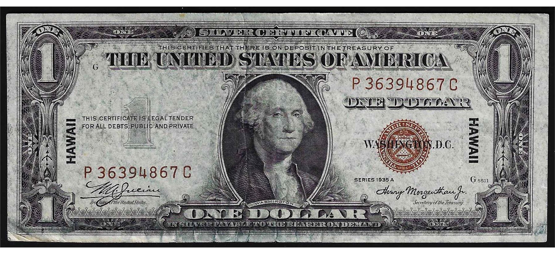 One 1935A $1 Hawaii Silver Certificate WWII Emergency Note.