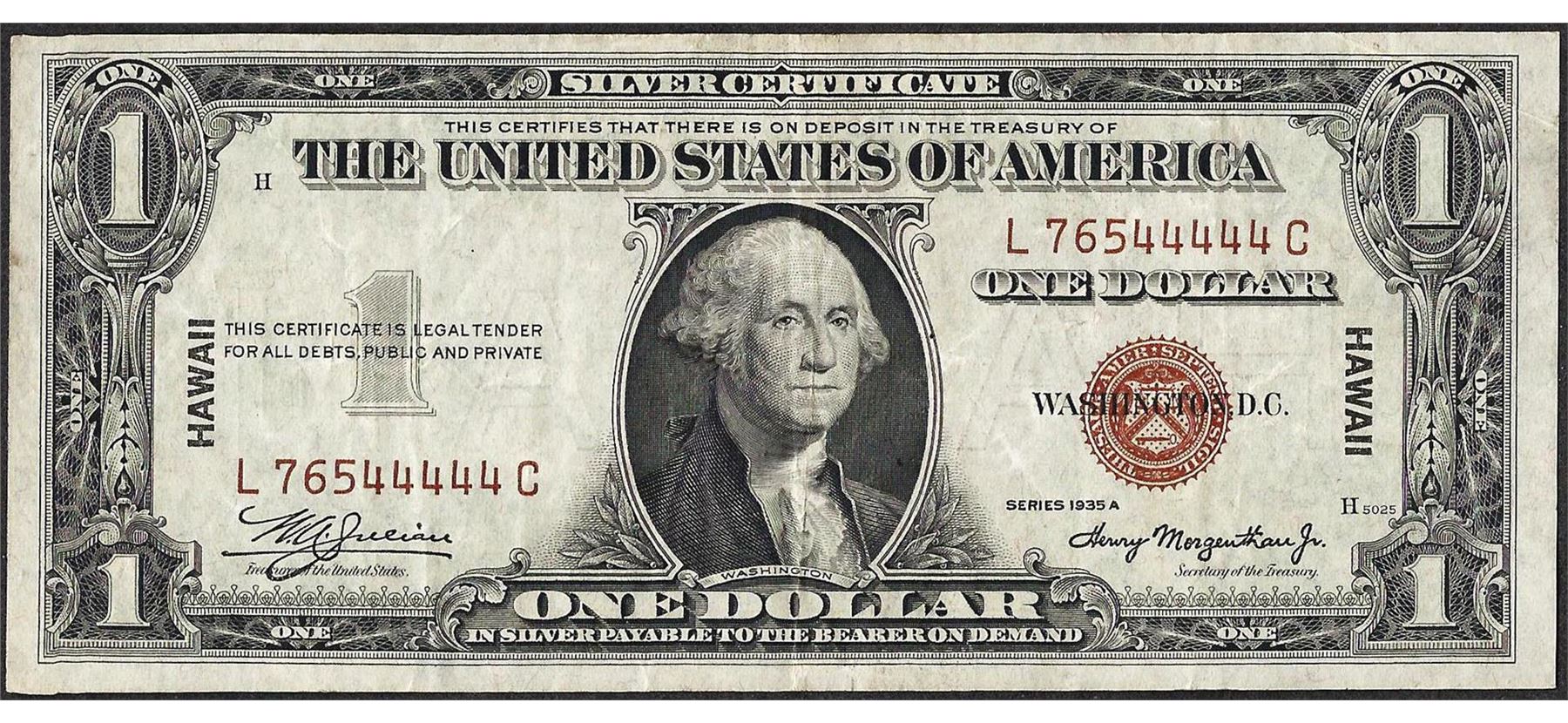 One 1935A $1 Hawaii Silver Certificate WWII Emergency Note.