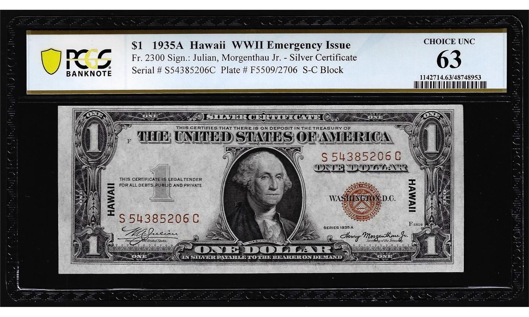 One 1935A $1 Hawaii WWII Emergency Issue Silver Certificate Note PCGS Choice Unc 63. PCGS Graded.
