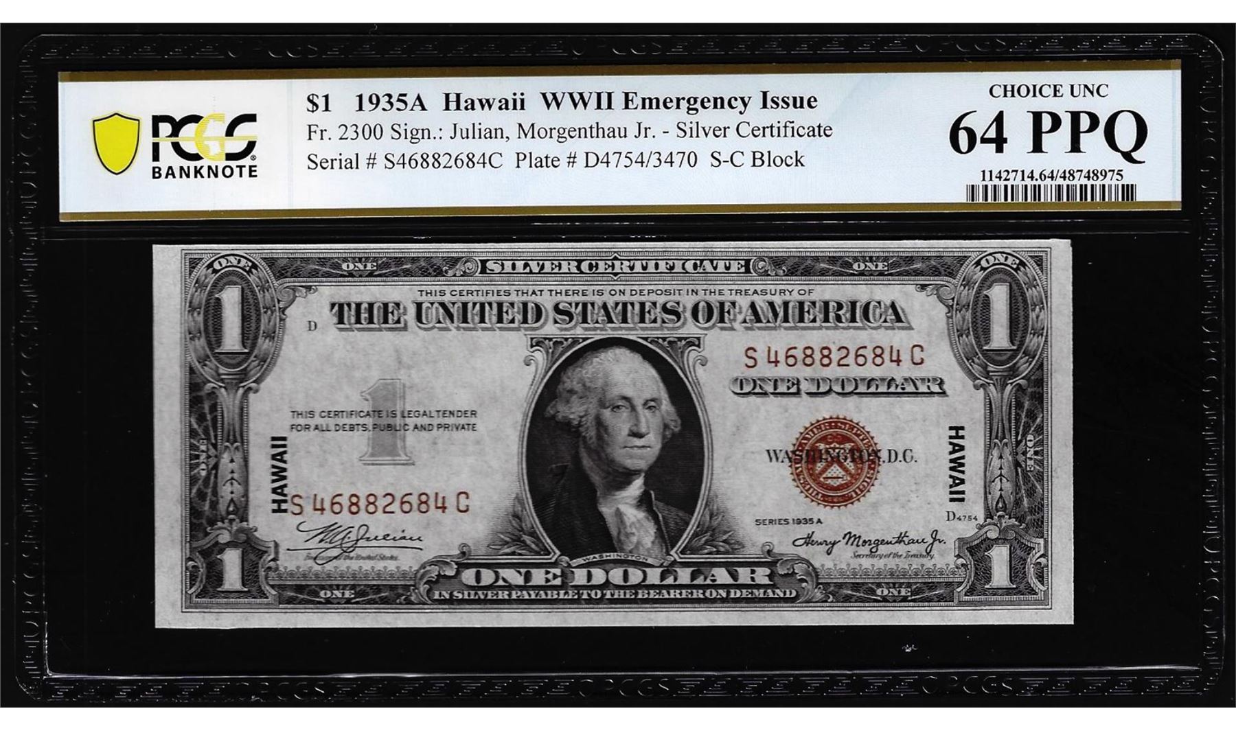 One 1935A $1 Hawaii WWII Emergency Issue Silver Certificate Note PCGS Choice Unc 64PPQ. PCGS Graded.