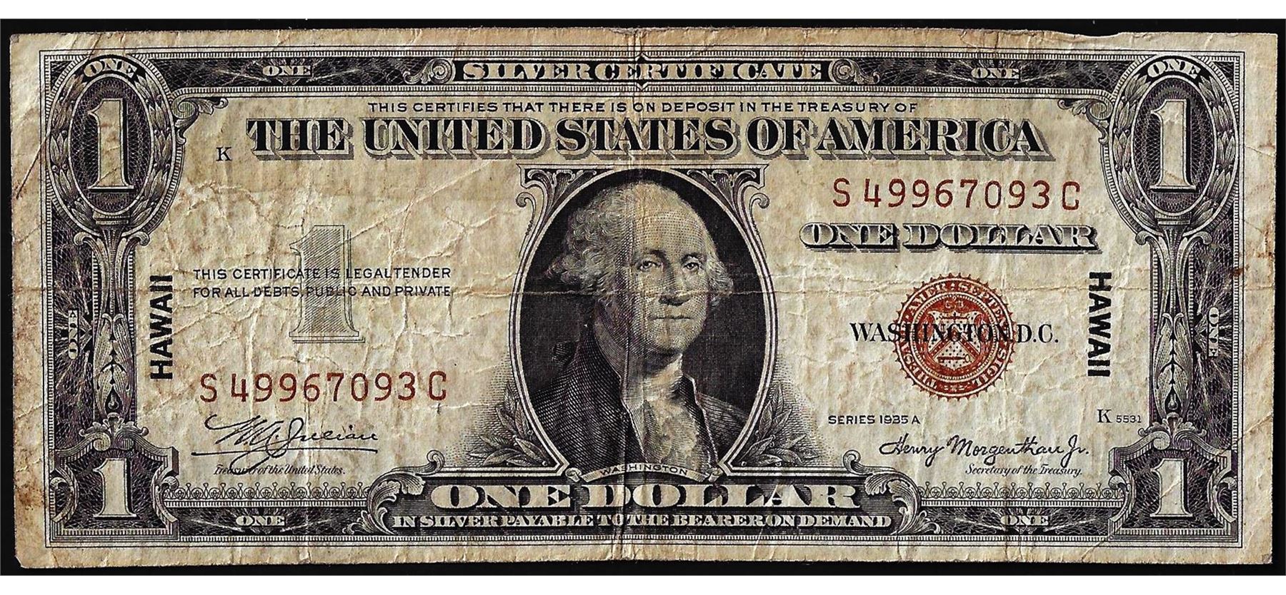 One 1935A $1 Hawaii WWII Emergency Issue Silver Certificate Note.