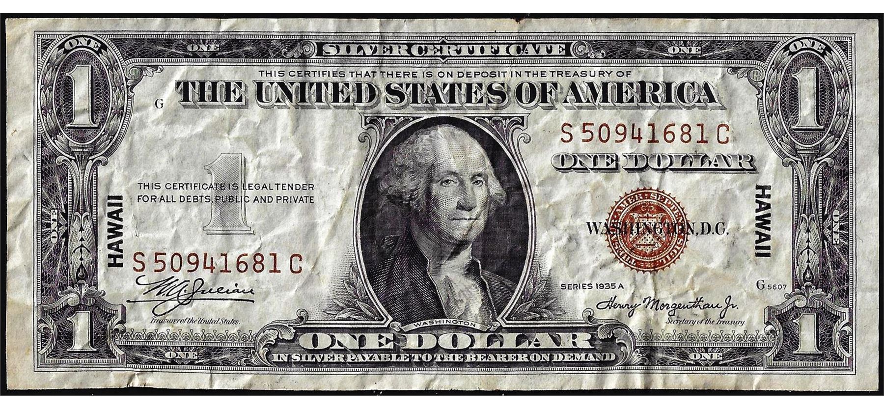 One 1935A $1 Hawaii WWII Emergency Issue Silver Certificate Note.