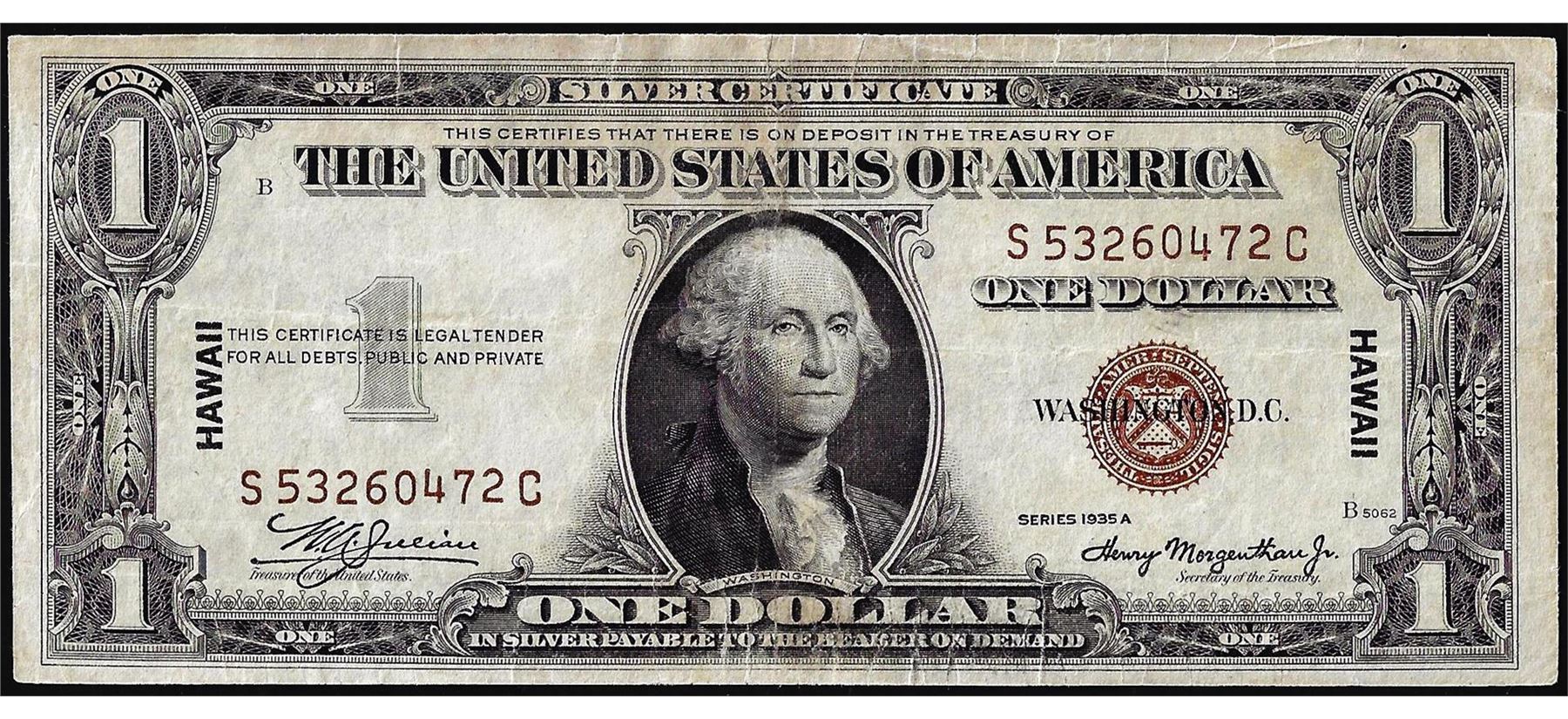 One 1935A $1 Hawaii WWII Emergency Issue Silver Certificate Note.