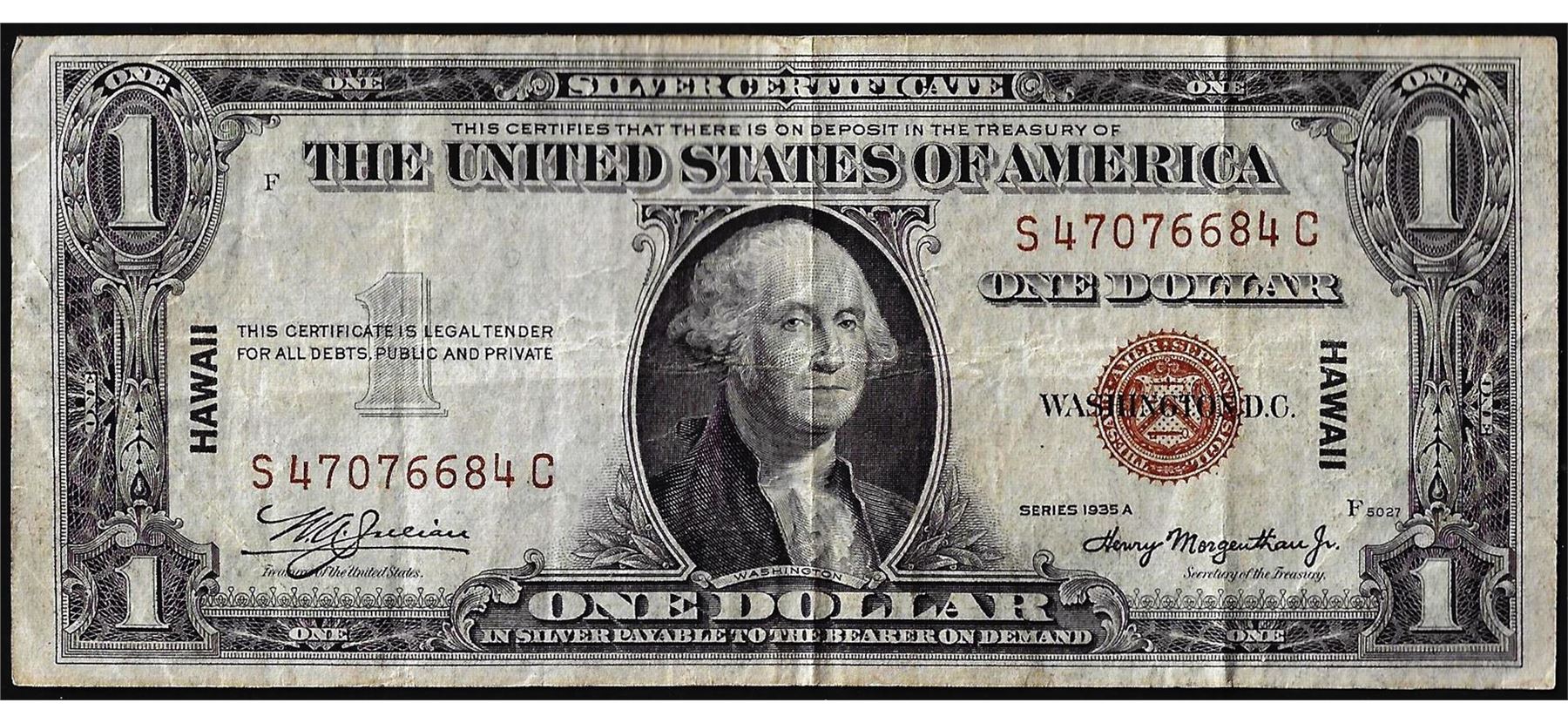 One 1935A $1 Hawaii WWII Emergency Issue Silver Certificate Note.