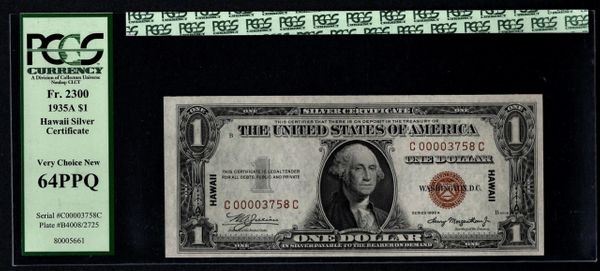 One 1935A $1 Low Serial Hawaii Silver Certificate PCGS 64PPQ.