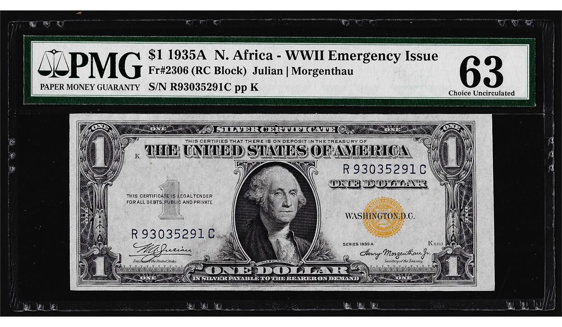 One 1935A $1 North Africa Silver Certificate Emergency Note PMG Choice Uncirculated 63. PMG Certified.