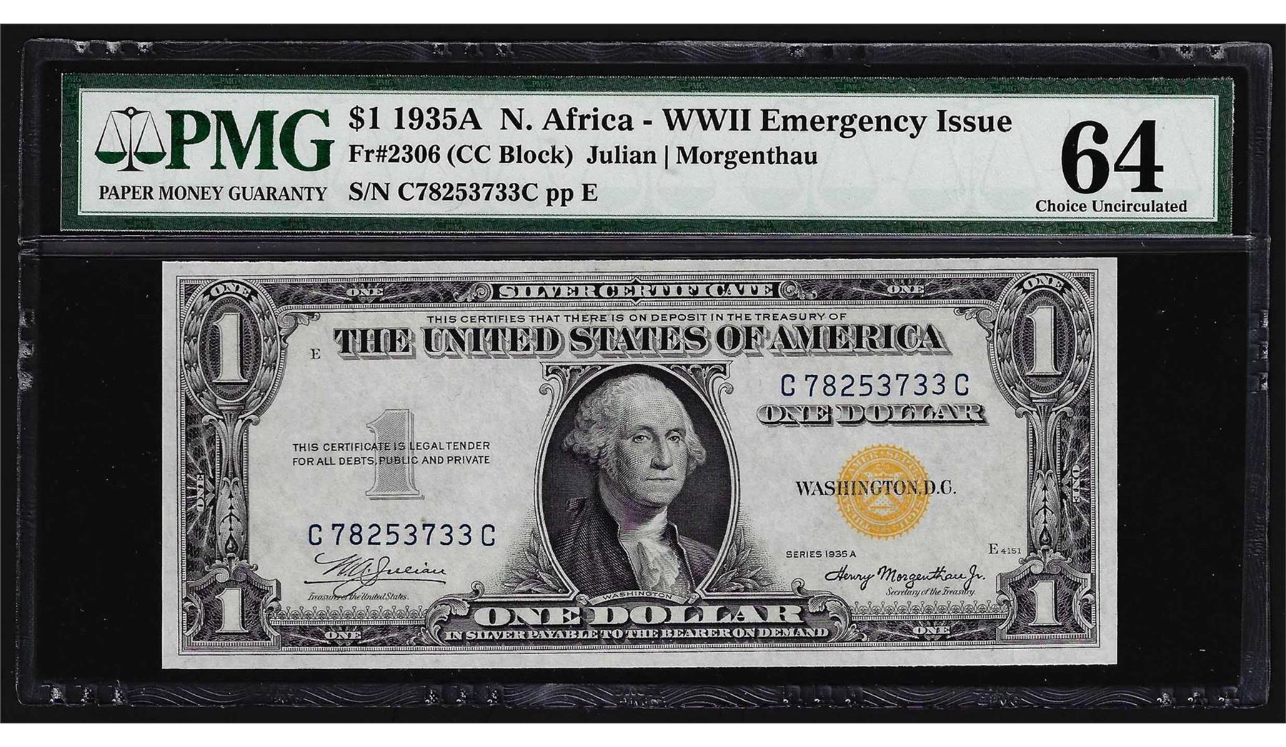 One 1935A $1 North Africa Silver Certificate WWII Emergency Note PMG CU64. PMG Certified.