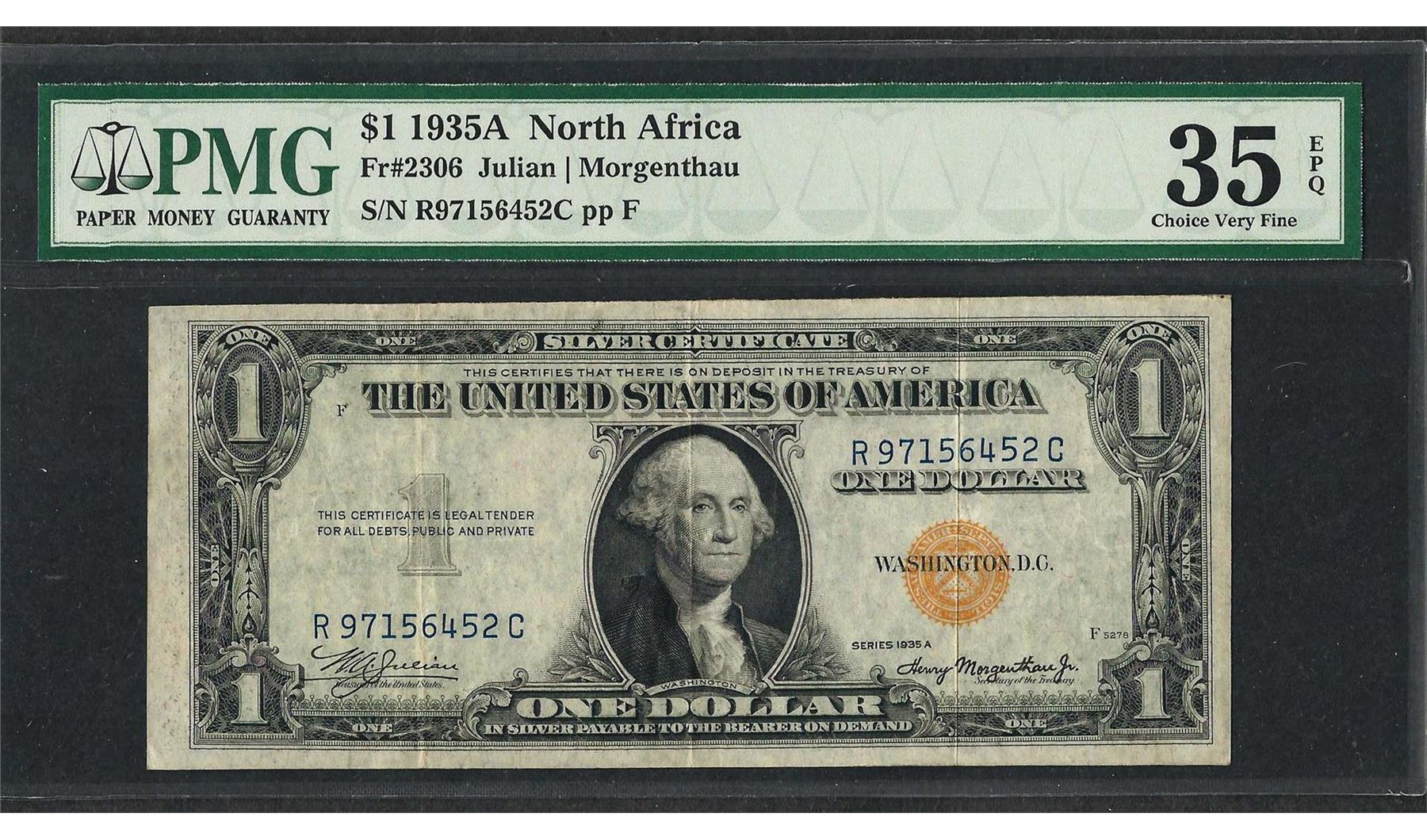 One 1935A $1 North Africa Silver Certificate WWII Emergency Note PMG Choice Very Fine 35EPQ. PMG Appraised.