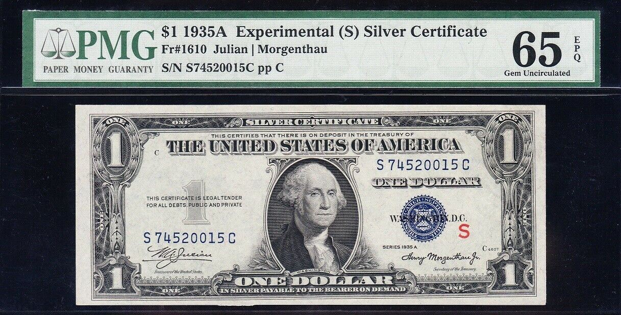 One 1935A $1 S Experimental Silver Cert PMG 65EPQ.