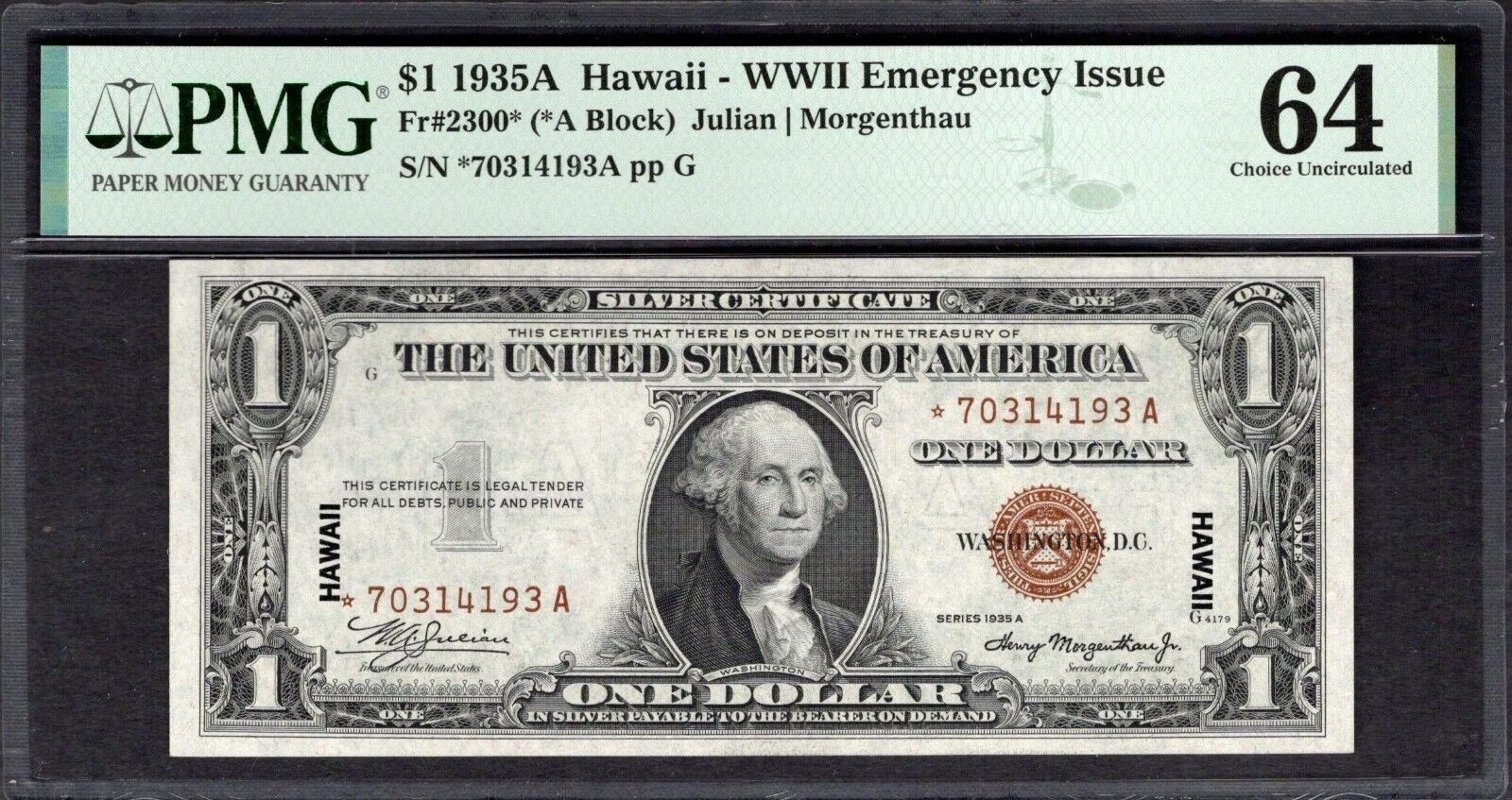 One 1935A $1 STAR Hawaii Silver Certificate PMG 64.