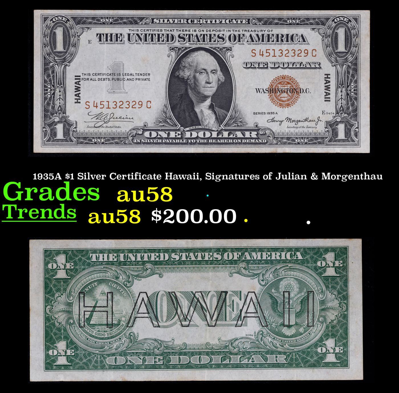 1935A $1 Silver Certificate Hawaii, Signatures of Julian & Morgenthau Grades Choice AU/BU Slider