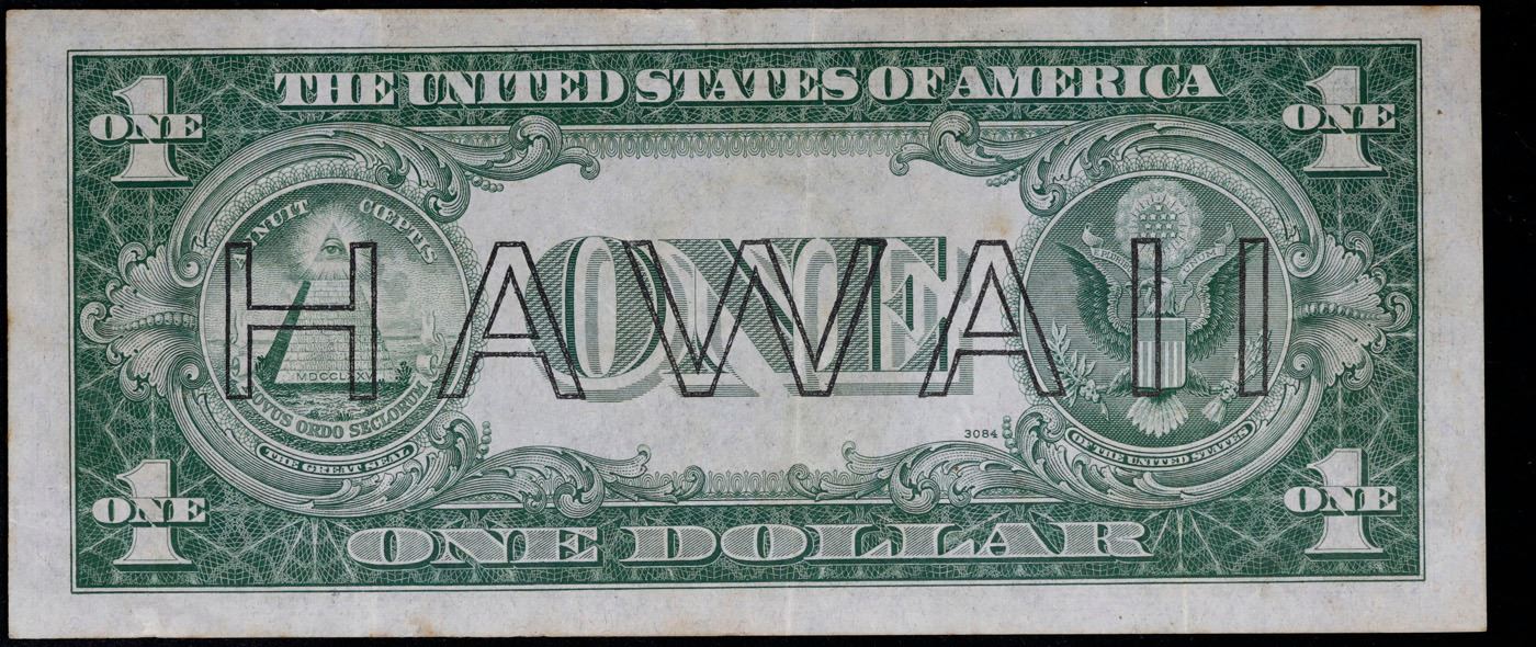 1935A $1 Silver Certificate Hawaii, Signatures of Julian & Morgenthau Grades Choice AU/BU Slider. The $1 Hawaii Note Came in 7 Blocks the SC Block Which is the most common, The LC, PC, CC, and YB Blocks are All equialy as rare but are much less common then the SC Block. Then there are the ZB and AC Blocks which are Very Rare. 1935a $1 Silver Certificate Hawaii, Signatures of Julian & Morgenthau Grades. It was the darkest days of World War II, just after Pearl Harbor. Everybody in Hawaii was sitting on pins and needles. Were the Japanese preparing a massive invasion of the islands? If they did invade, they could use the millions of dollars in currency on the islands to buy war material. To thwart this, these $1 Federal Reserve Notes were sent to the islands. Each has a large HAWAII printed on the reverse. If the Japanese did invade, the currency would be demonetized. After the threat passed, most of these "Hawaii" Notes were destroyed. Today they're hard to find.