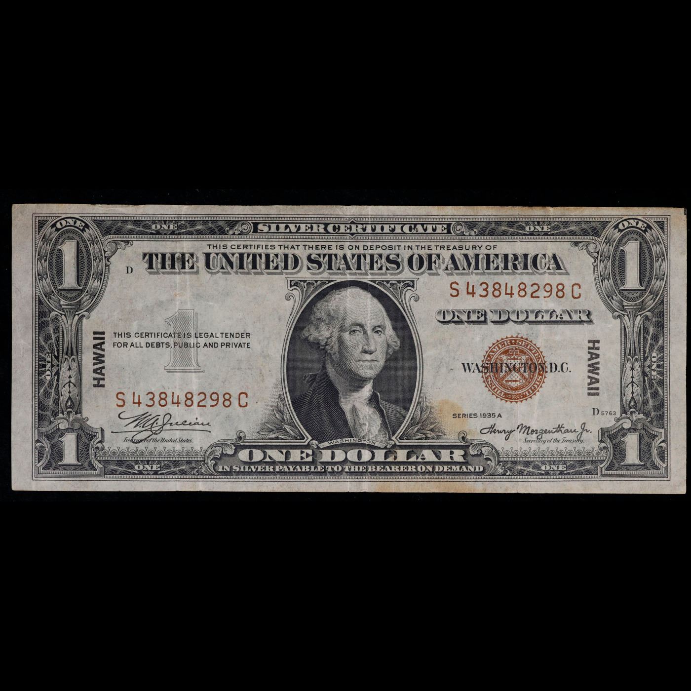 1935A $1 Silver Certificate Hawaii, Signatures of Julian & Morgenthau Grades vf++. The $1 Hawaii Note Came in 7 Blocks the SC Block Which is the most common, The LC, PC, CC, and YB Blocks are All equialy as rare but are much less common then the SC Block. Then there are the ZB and AC Blocks which are Very Rare. 1935a $1 Silver Certificate Hawaii, Signatures of Julian & Morgenthau Grades. It was the darkest days of World War II, just after Pearl Harbor. Everybody in Hawaii was sitting on pins and needles. Were the Japanese preparing a massive invasion of the islands? If they did invade, they could use the millions of dollars in currency on the islands to buy war material. To thwart this, these $1 Federal Reserve Notes were sent to the islands. Each has a large HAWAII printed on the reverse. If the Japanese did invade, the currency would be demonetized. After the threat passed, most of these "Hawaii" Notes were destroyed. Today they're hard to find.