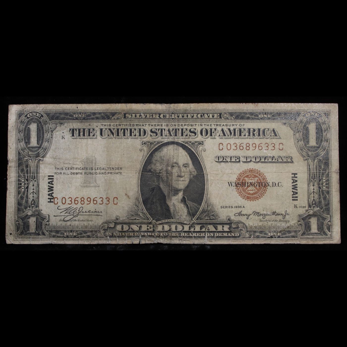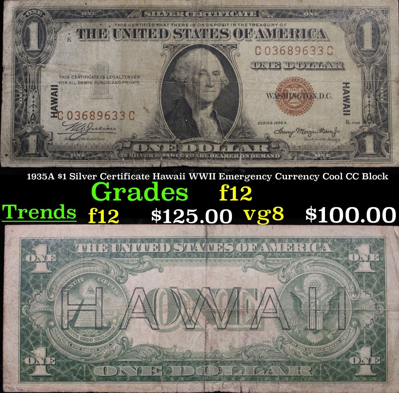1935A $1 Silver Certificate Hawaii WWII Emergency Currency Cool CC Block Grades f, fine. 1935a $1 Silver Certificate Hawaii, Signatures of Julian & Morgenthau Cool CC Block. It was the darkest days of World War II, just after Pearl Harbor. Everybody in Hawaii was sitting on pins and needles. Were the Japanese preparing a massive invasion of the islands? If they did invade, they could use the millions of dollars in currency on the islands to buy war material. To thwart this, these $1 Federal Reserve Notes were sent to the islands. Each has a large HAWAII printed on the reverse. If the Japanese did invade, the currency would be demonetized. After the threat passed, most of these "Hawaii" Notes were destroyed. Today they're hard to find.