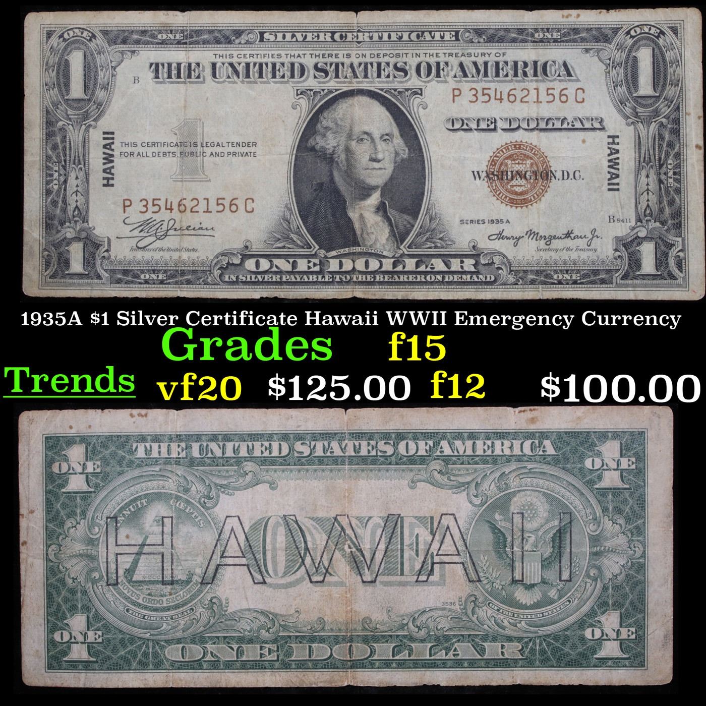 1935A $1 Silver Certificate Hawaii WWII Emergency Currency Grades f+. 1935a $1 Silver Certificate Hawaii, Signatures of Julian & Morgenthau Grades. It was the darkest days of World War II, just after Pearl Harbor. Everybody in Hawaii was sitting on pins and needles. Were the Japanese preparing a massive invasion of the islands? If they did invade, they could use the millions of dollars in currency on the islands to buy war material. To thwart this, these $1 Federal Reserve Notes were sent to the islands. Each has a large HAWAII printed on the reverse. If the Japanese did invade, the currency would be demonetized. After the threat passed, most of these "Hawaii" Notes were destroyed. Today they're hard to find.