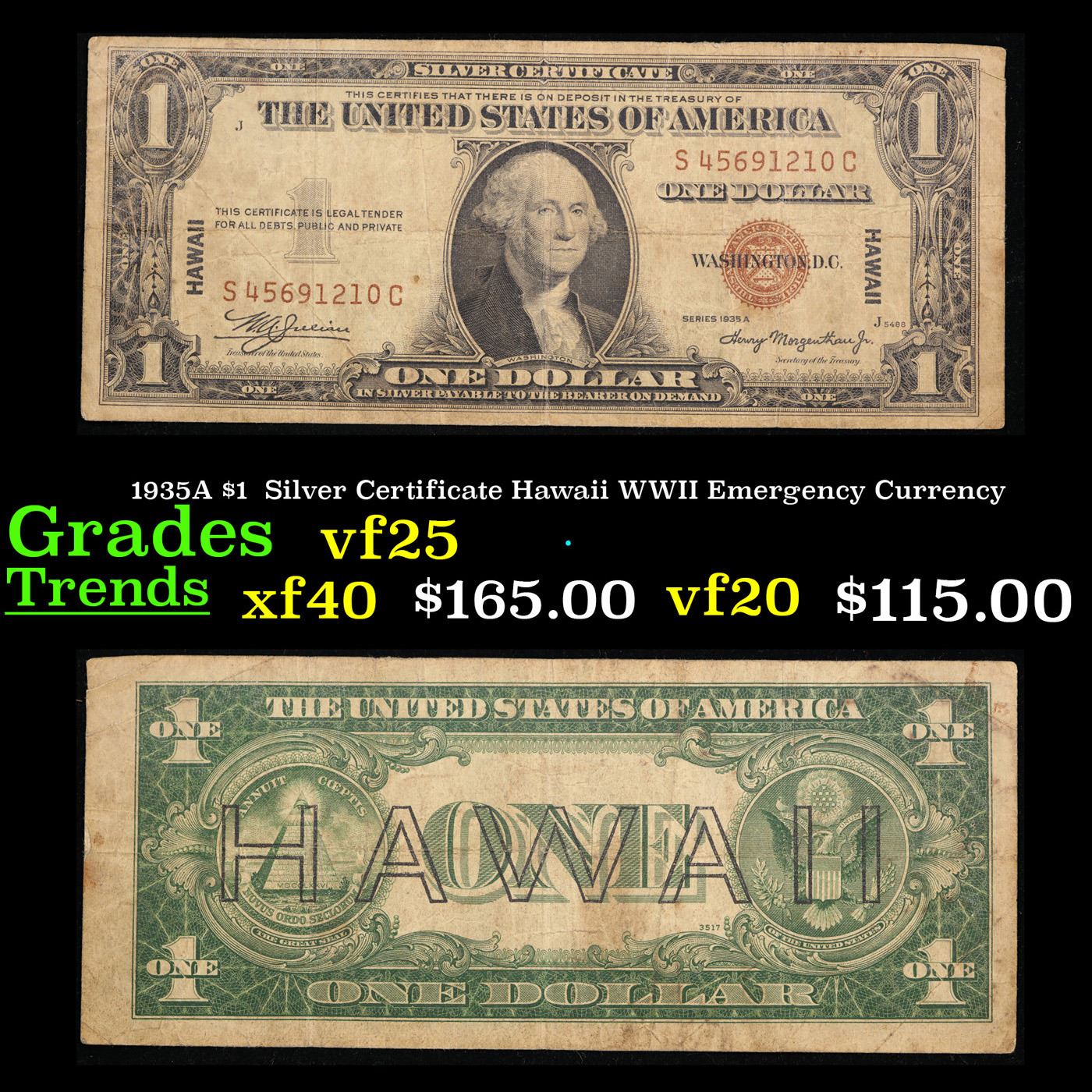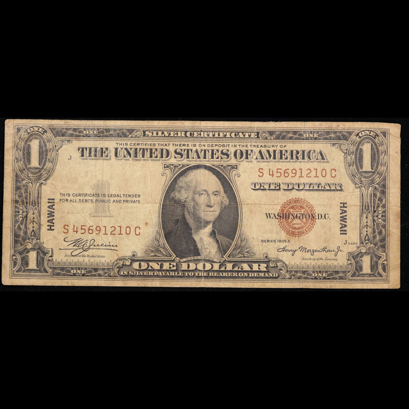 1935A $1 Silver Certificate Hawaii WWII Emergency Currency Grades vf+. A short snorter is a banknote inscribed by people traveling together on an aircraft. The tradition was started by Alaskan bush flyers in the 1920s and spread through the military and commercial aviation.[1][2] During World War II short snorters were signed by flight crews and conveyed good luck to soldiers crossing the Atlantic.[3] Friends would take the local currency and sign each other's bills creating a "keepsake of your buddy's signatures". The General Hoyt Vandenberg short snorter was started in June 1942 flight over the mid-Atlantic. The Harry Hopkins short snorter was collected on July 25, 1942, by an aide of Franklin D. Roosevelt at a London Conference. The D. Ray Comish short snorter was collected January 1943 at the Casablanca Conference by Dixie Clipper. The Averell Harriman short snorter was collected by him at the January 1943 Casablanca Conference as well. The General George S. Patton snorter signatures were also collected at the Casablanca Conference. The Yalta short snorter signatures were collected on February 4–11, 1945 by Steve Early at Yalta, on the Crimean Peninsula. The Note at hand is a WWII Short Snorter Signed by 13 Different Soldiers During WWII. Not Only is this a very Cool "Short Snorter" But its on a Rare $1 Hawaii. 1935a $1 Silver Certificate Hawaii, Signatures of Julian & Morgenthau Grades. It was the darkest days of World War II, just after Pearl Harbor. Everybody in Hawaii was sitting on pins and needles. Were the Japanese preparing a massive invasion of the islands? If they did invade, they could use the millions of dollars in currency on the islands to buy war material. To thwart this, these $1 Federal Reserve Notes were sent to the islands. Each has a large HAWAII printed on the reverse. If the Japanese did invade, the currency would be demonetized. After the threat passed, most of these "Hawaii" Notes were destroyed. Today they're hard to find.