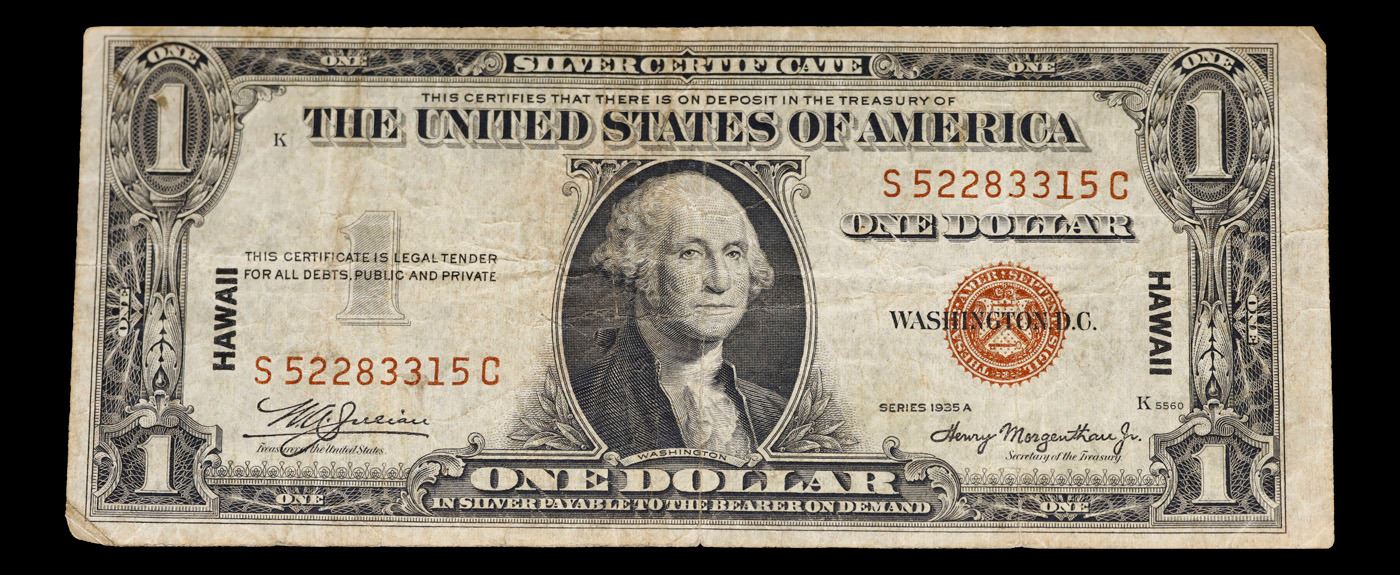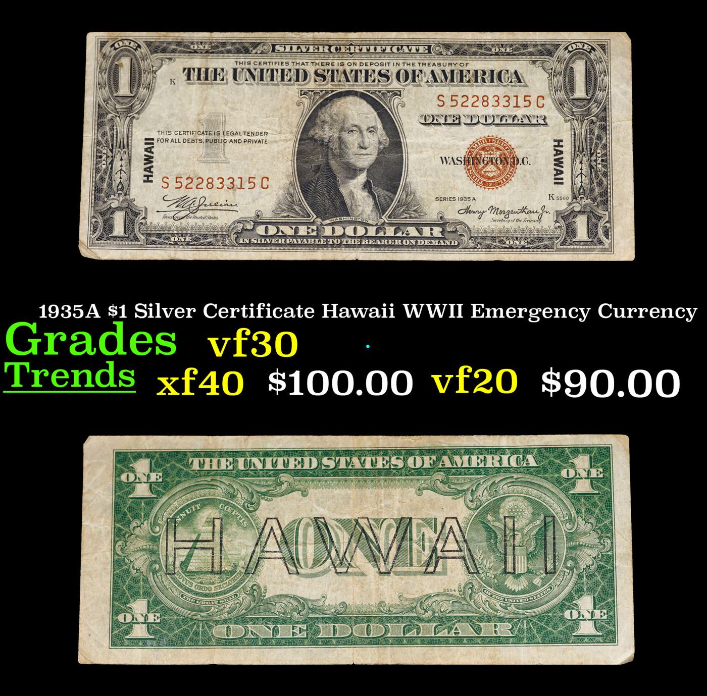1935A $1 Silver Certificate Hawaii WWII Emergency Currency Grades vf++. The $1 Hawaii Note Came in 7 Blocks the SC Block Which is the most common, The LC, PC , CC, and YB Blocks are All equialy as rare but are much less common then the SC Block. Then there are the ZB and AC (This Note) Blocks which are Very Rare. Out of about 35 Million Total $1 Hawaii Notes Printed Less then 3% of them were this Key A-C Block. 1935a $1 Silver Certificate Hawaii, Signatures of Julian & Morgenthau Grades. It was the darkest days of World War II, just after Pearl Harbor. Everybody in Hawaii was sitting on pins and needles. Were the Japanese preparing a massive invasion of the islands? If they did invade, they could use the millions of dollars in currency on the islands to buy war material. To thwart this, these $1 Federal Reserve Notes were sent to the islands. Each has a large HAWAII printed on the reverse. If the Japanese did invade, the currency would be demonetized. After the threat passed, most of these "Hawaii" Notes were destroyed. Today they're hard to find.