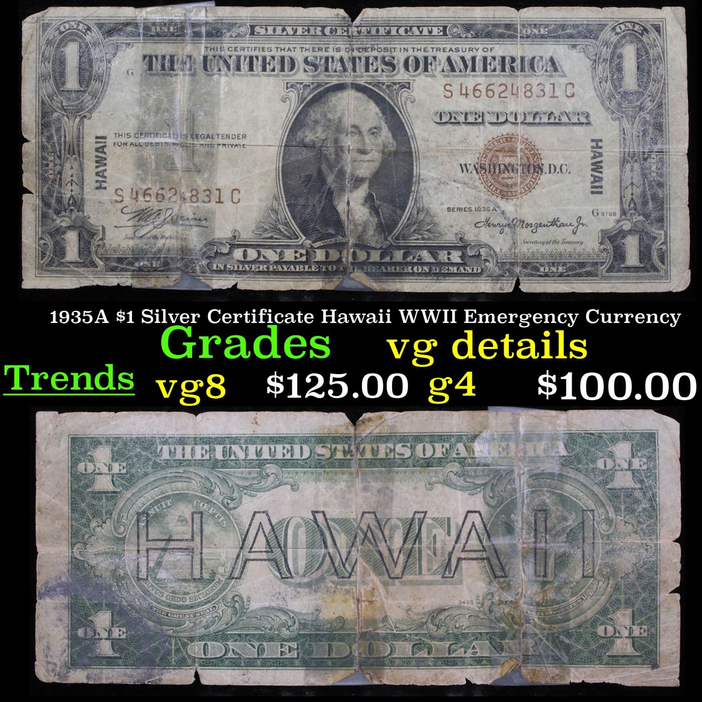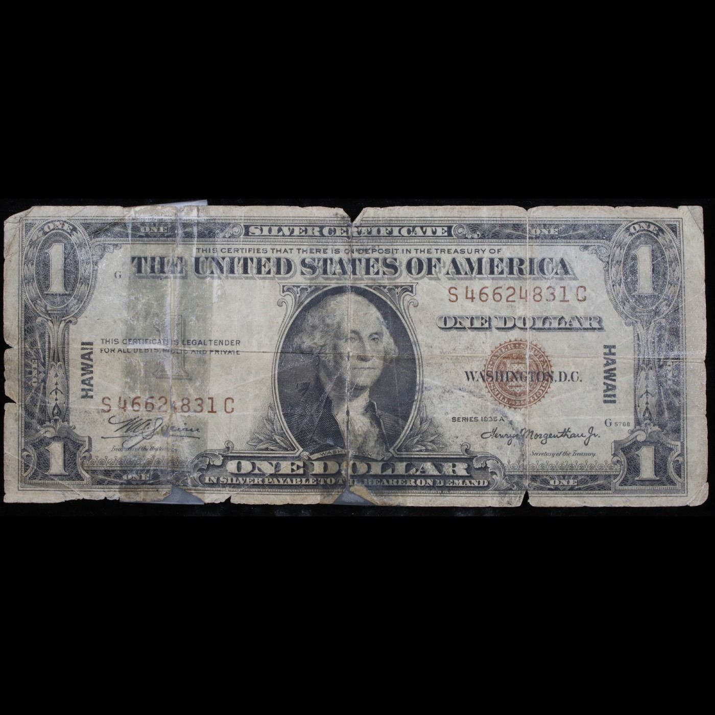 1935A $1 Silver Certificate Hawaii WWII Emergency Currency Grades vg details. 1935a $1 Silver Certificate Hawaii, Signatures of Julian & Morgenthau Grades. It was the darkest days of World War II, just after Pearl Harbor. Everybody in Hawaii was sitting on pins and needles. Were the Japanese preparing a massive invasion of the islands? If they did invade, they could use the millions of dollars in currency on the islands to buy war material. To thwart this, these $1 Federal Reserve Notes were sent to the islands. Each has a large HAWAII printed on the reverse. If the Japanese did invade, the currency would be demonetized. After the threat passed, most of these "Hawaii" Notes were destroyed. Today they're hard to find.