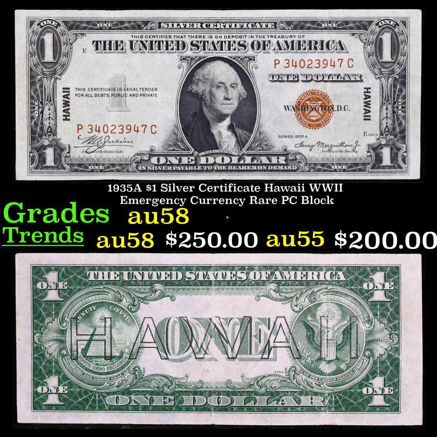 1935A $1 Silver Certificate Hawaii WWII Emergency Currency Rare PC Block Grades Choice AU/BU Slider. The $1 Hawaii Note Came in 7 Blocks the SC Block Which is the most common, The LC, PC, CC, and YB Blocks are All equialy as rare but are much less common then the SC Block. Then there are the ZB and AC Blocks which are Very Rare. 1935a $1 Silver Certificate Hawaii, Signatures of Julian & Morgenthau Grades. It was the darkest days of World War II, just after Pearl Harbor. Everybody in Hawaii was sitting on pins and needles. Were the Japanese preparing a massive invasion of the islands? If they did invade, they could use the millions of dollars in currency on the islands to buy war material. To thwart this, these $1 Federal Reserve Notes were sent to the islands. Each has a large HAWAII printed on the reverse. If the Japanese did invade, the currency would be demonetized. After the threat passed, most of these "Hawaii" Notes were destroyed. Today they're hard to find.