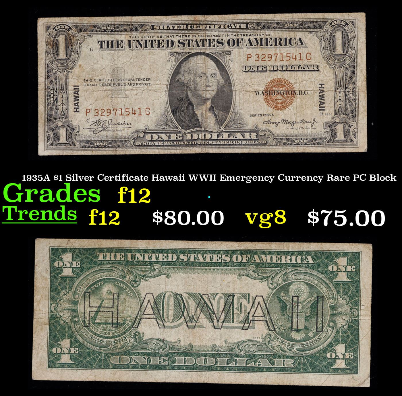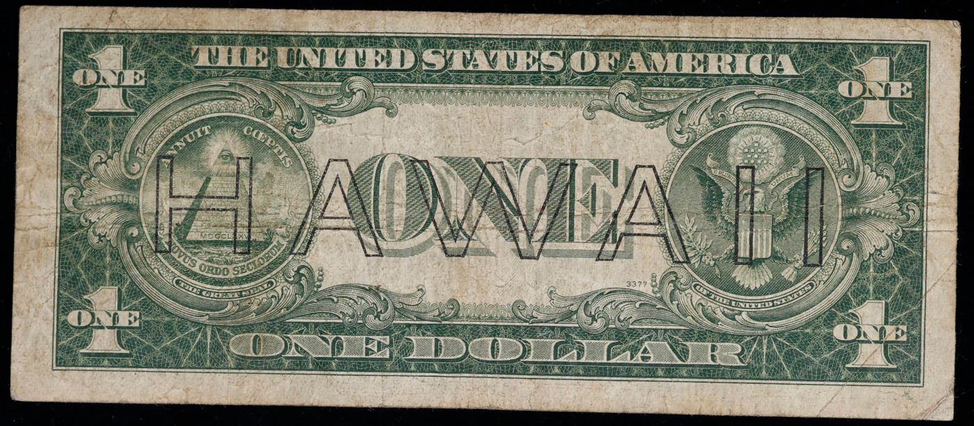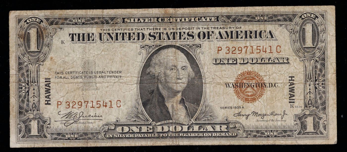 1935A $1 Silver Certificate Hawaii WWII Emergency Currency Rare PC Block Grades f, fine. The $1 Hawaii Note Came in 7 Blocks the SC Block Which is the most common, The LC, PC, CC, and YB Blocks are All equialy as rare but are much less common then the SC Block. Then there are the ZB and AC Blocks which are Very Rare. 1935a $1 Silver Certificate Hawaii, Signatures of Julian & Morgenthau Grades. It was the darkest days of World War II, just after Pearl Harbor. Everybody in Hawaii was sitting on pins and needles. Were the Japanese preparing a massive invasion of the islands? If they did invade, they could use the millions of dollars in currency on the islands to buy war material. To thwart this, these $1 Federal Reserve Notes were sent to the islands. Each has a large HAWAII printed on the reverse. If the Japanese did invade, the currency would be demonetized. After the threat passed, most of these "Hawaii" Notes were destroyed. Today they're hard to find.