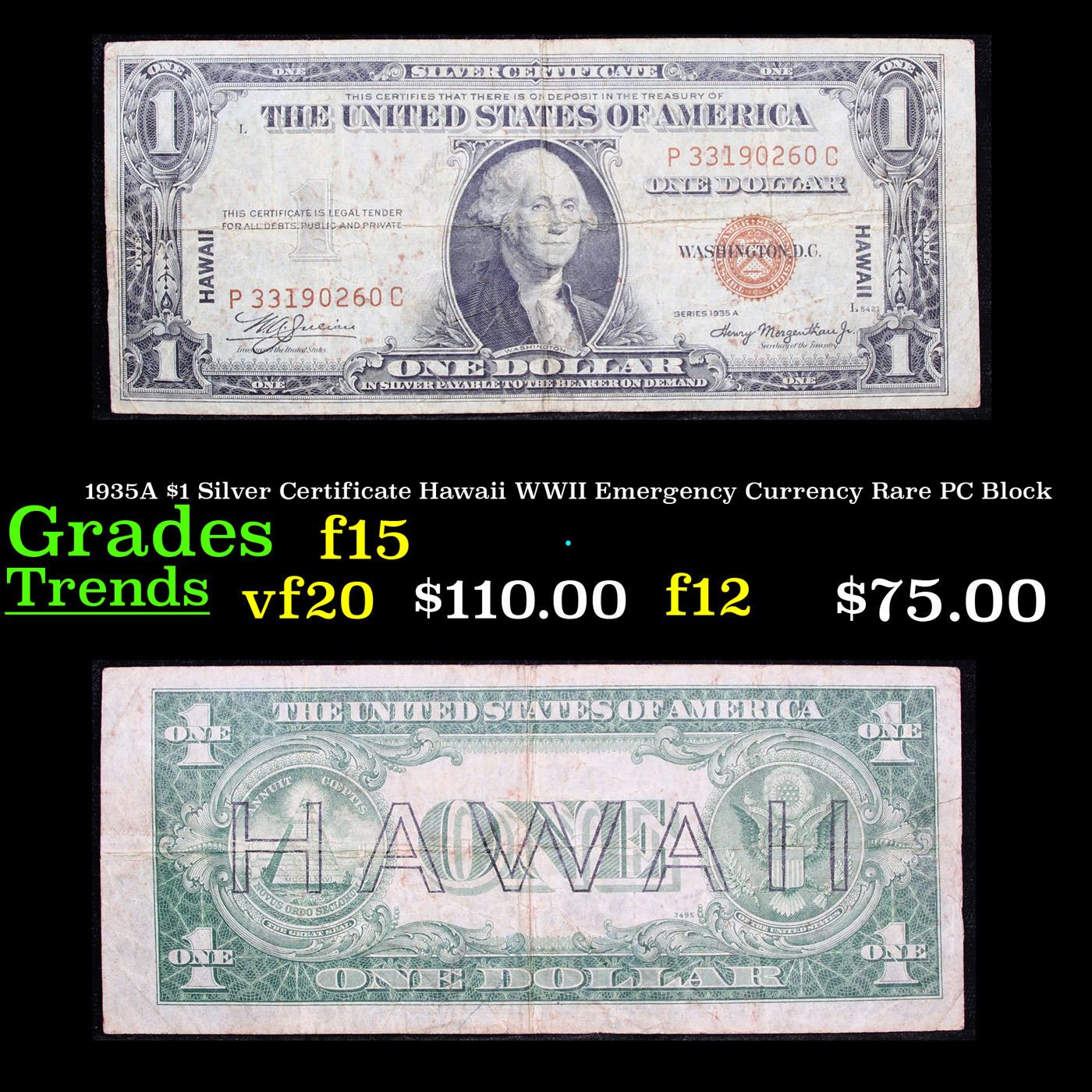 1935A $1 Silver Certificate Hawaii WWII Emergency Currency Rare PC Block Grades f+. The $1 Hawaii Note Came in 7 Blocks the SC Block Which is the most common, The LC, PC (This Note), CC, and YB Blocks are All equialy as rare but are much less common then the SC Block. Then there are the ZB and AC Blocks which are Very Rare. 1935a $1 Silver Certificate Hawaii, Signatures of Julian & Morgenthau Grades. It was the darkest days of World War II, just after Pearl Harbor. Everybody in Hawaii was sitting on pins and needles. Were the Japanese preparing a massive invasion of the islands? If they did invade, they could use the millions of dollars in currency on the islands to buy war material. To thwart this, these $1 Federal Reserve Notes were sent to the islands. Each has a large HAWAII printed on the reverse. If the Japanese did invade, the currency would be demonetized. After the threat passed, most of these "Hawaii" Notes were destroyed. Today they're hard to find.