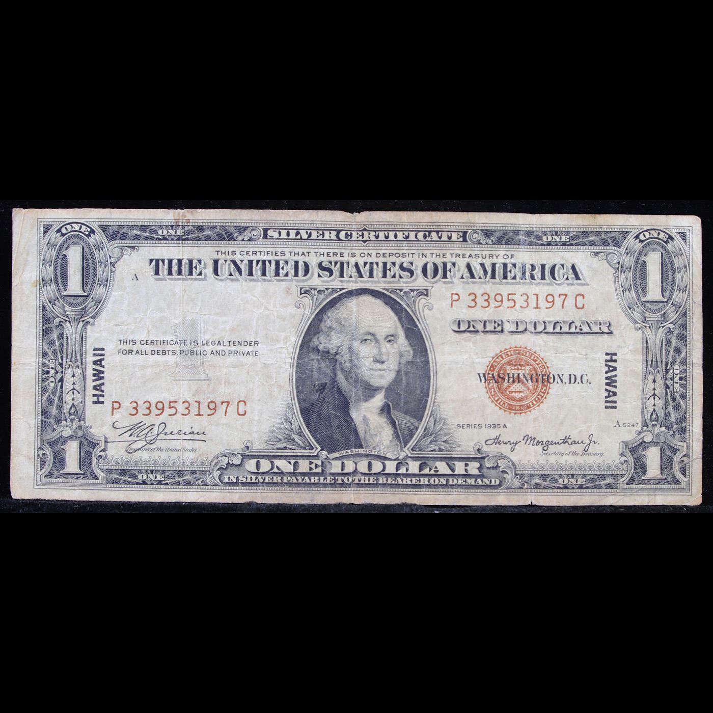 1935A $1 Silver Certificate Hawaii WWII Emergency Currency Rare PC Block Grades vf+. The $1 Hawaii Note Came in 7 Blocks the SC Block Which is the most common, The LC, PC (This Note), CC, and YB Blocks are All equialy as rare but are much less common then the SC Block. Then there are the ZB and AC Blocks which are Very Rare. 1935a $1 Silver Certificate Hawaii, Signatures of Julian & Morgenthau Grades. It was the darkest days of World War II, just after Pearl Harbor. Everybody in Hawaii was sitting on pins and needles. Were the Japanese preparing a massive invasion of the islands? If they did invade, they could use the millions of dollars in currency on the islands to buy war material. To thwart this, these $1 Federal Reserve Notes were sent to the islands. Each has a large HAWAII printed on the reverse. If the Japanese did invade, the currency would be demonetized. After the threat passed, most of these "Hawaii" Notes were destroyed. Today they're hard to find.