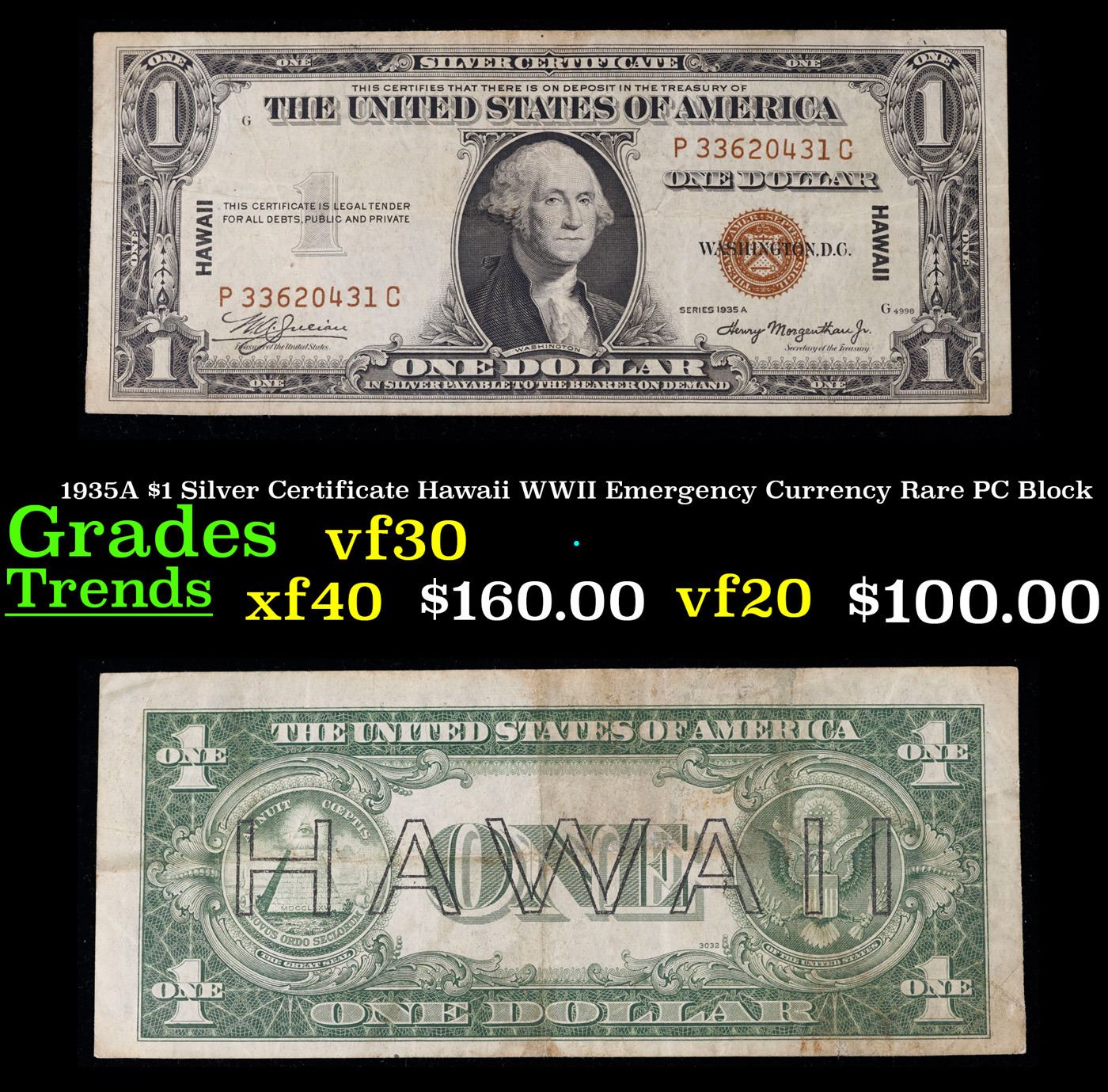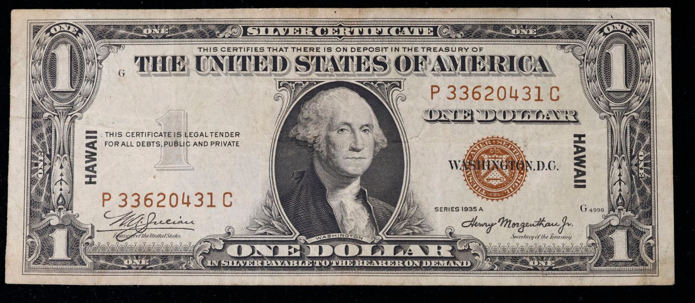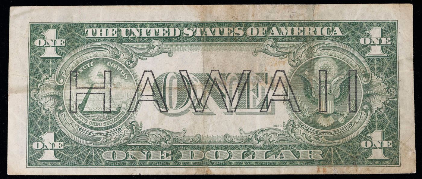 1935A $1 Silver Certificate Hawaii WWII Emergency Currency Rare PC Block Grades vf++. The $1 Hawaii Note Came in 7 Blocks the SC Block Which is the most common, The LC, PC, CC, and YB Blocks are All equialy as rare but are much less common then the SC Block. Then there are the ZB and AC Blocks which are Very Rare. 1935a $1 Silver Certificate Hawaii, Signatures of Julian & Morgenthau Grades. It was the darkest days of World War II, just after Pearl Harbor. Everybody in Hawaii was sitting on pins and needles. Were the Japanese preparing a massive invasion of the islands? If they did invade, they could use the millions of dollars in currency on the islands to buy war material. To thwart this, these $1 Federal Reserve Notes were sent to the islands. Each has a large HAWAII printed on the reverse. If the Japanese did invade, the currency would be demonetized. After the threat passed, most of these "Hawaii" Notes were destroyed. Today they're hard to find.