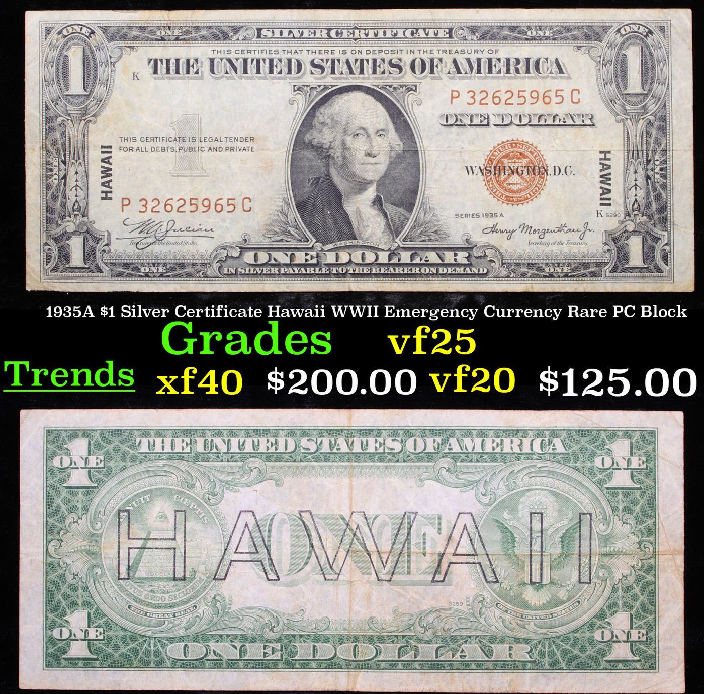 1935A $1 Silver Certificate Hawaii WWII Emergency Currency Rare PC Block vf+. The $1 Hawaii Note Came in 7 Blocks the SC Block Which is the most common, The LC, PC (This Note), CC, and YB Blocks are All equialy as rare but are much less common then the SC Block. Then there are the ZB and AC Blocks which are Very Rare. 1935a $1 Silver Certificate Hawaii, Signatures of Julian & Morgenthau Grades. It was the darkest days of World War II, just after Pearl Harbor. Everybody in Hawaii was sitting on pins and needles. Were the Japanese preparing a massive invasion of the islands? If they did invade, they could use the millions of dollars in currency on the islands to buy war material. To thwart this, these $1 Federal Reserve Notes were sent to the islands. Each has a large HAWAII printed on the reverse. If the Japanese did invade, the currency would be demonetized. After the threat passed, most of these "Hawaii" Notes were destroyed. Today they're hard to find.