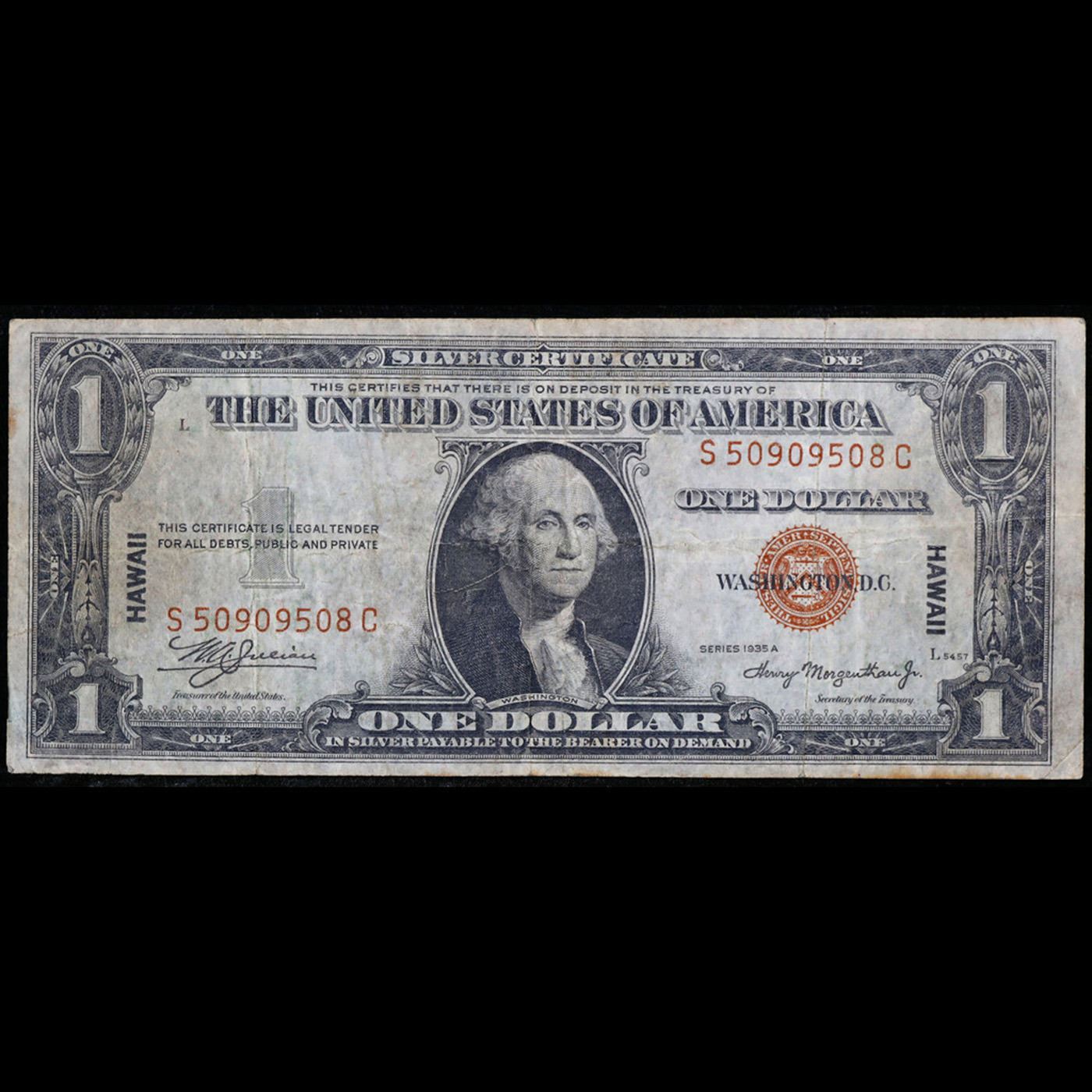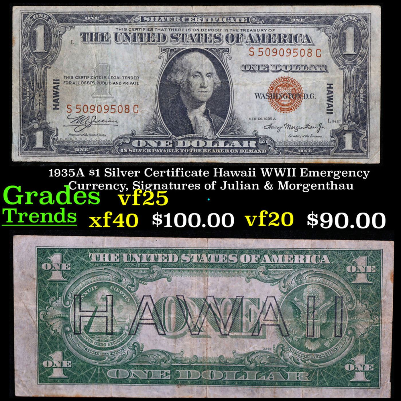 1935A $1 Silver Certificate Hawaii WWII Emergency Currency, Signatures of Julian & Morgenthau Grades vf+. 1935a $1 Silver Certificate Hawaii, Signatures of Julian & Morgenthau Grades. It was the darkest days of World War II, just after Pearl Harbor. Everybody in Hawaii was sitting on pins and needles. Were the Japanese preparing a massive invasion of the islands? If they did invade, they could use the millions of dollars in currency on the islands to buy war material. To thwart this, these $1 Federal Reserve Notes were sent to the islands. Each has a large HAWAII printed on the reverse. If the Japanese did invade, the currency would be demonetized. After the threat passed, most of these "Hawaii" Notes were destroyed. Today they're hard to find.