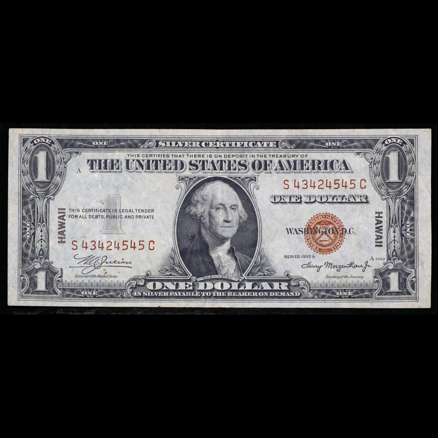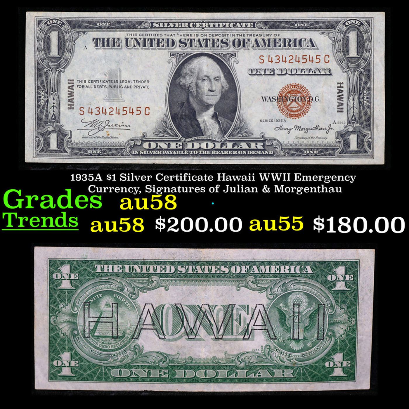 1935A $1 Silver Certificate Hawaii WWII Emergency Currency, Signatures of Julian & Morgenthau Grades Choice AU/BU Slider. 1935a $1 Silver Certificate Hawaii, Signatures of Julian & Morgenthau Grades. It was the darkest days of World War II, just after Pearl Harbor. Everybody in Hawaii was sitting on pins and needles. Were the Japanese preparing a massive invasion of the islands? If they did invade, they could use the millions of dollars in currency on the islands to buy war material. To thwart this, these $1 Federal Reserve Notes were sent to the islands. Each has a large HAWAII printed on the reverse. If the Japanese did invade, the currency would be demonetized. After the threat passed, most of these "Hawaii" Notes were destroyed. Today they're hard to find.