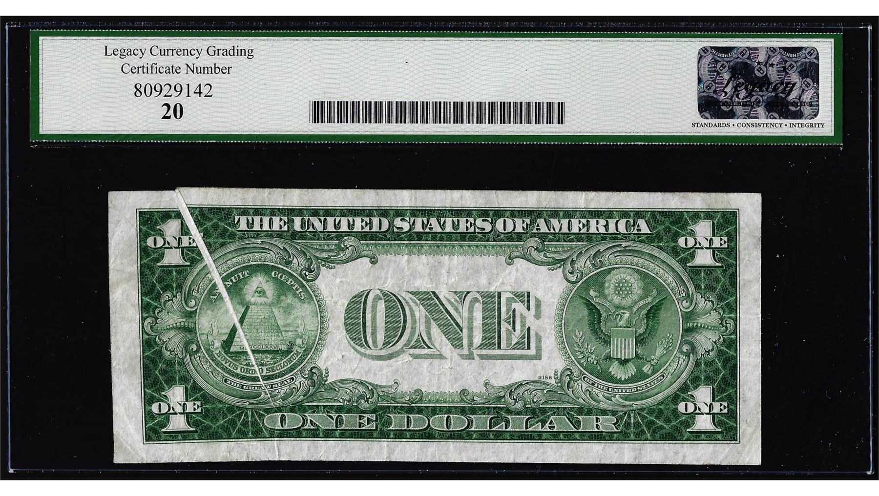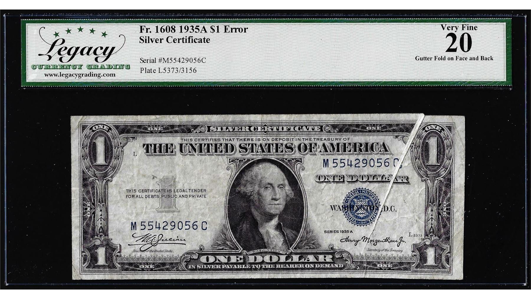 One 1935A $1 Silver Certificate Note Gutter Fold Error Fr.1608 Legacy Very Fine 20. Legacy Graded.
