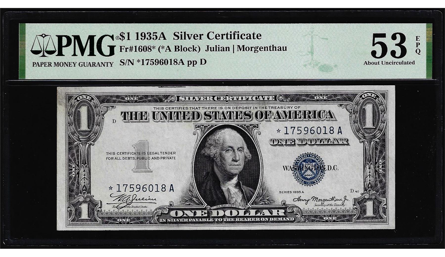 One 1935A $1 Silver Certificate STAR Note Fr.1608* PMG About Uncirculated 53EPQ. PMG Certified.
